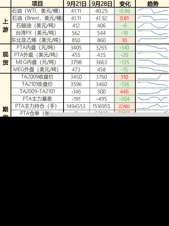 Last week, the ICE Brent November contract was unchanged from the previous week at $41.76/barrel. Since September, two sets of 5 million tons of production capacity of Xinfengming Phase II and Baihong units will be put into production in the fourth quarter. However, the current pressure on the polyester end is highlighted. Under the pressure of inventory, companies have cut prices to destock, resulting in serious filament losses. The PTA processing gap continues to be compressed, and the PTA operating rate returned to a high of around 90% last week. On the cost side, crude oil rebounded slightly and then fluctuated within a narrow range, with limited support for downstream products. In the short term, it is difficult for PTA to see profits, and it is waiting for the maintenance of several large equipment within the year.