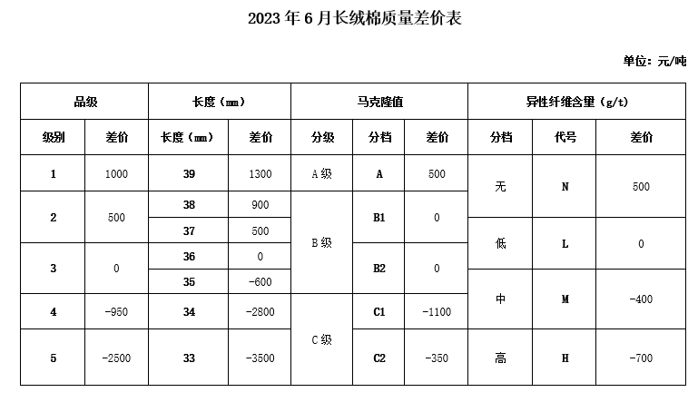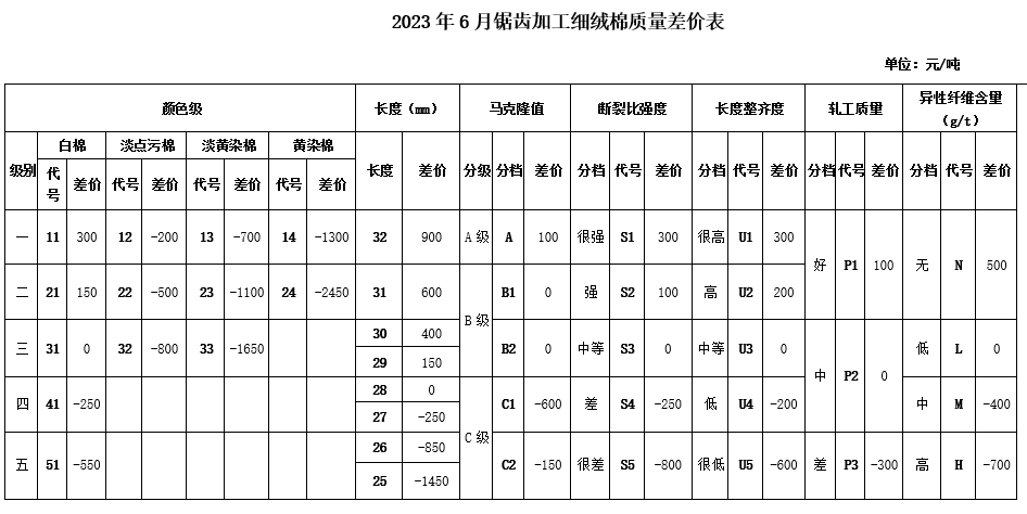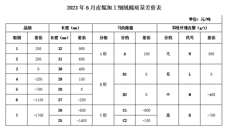 According to the “China Cotton Association Domestic CottonQuality Price Difference Management Measures” stipulates that the June 2023 “Quality Price Difference Table for Sawtooth Processed Fine Staple Cotton”, “Quality Price Difference Table for Top Roller Processed Fine Staple Cotton” and “Quality Price Difference Table for Long Staple Cotton” are officially released 》(Unit: Yuan/ton).