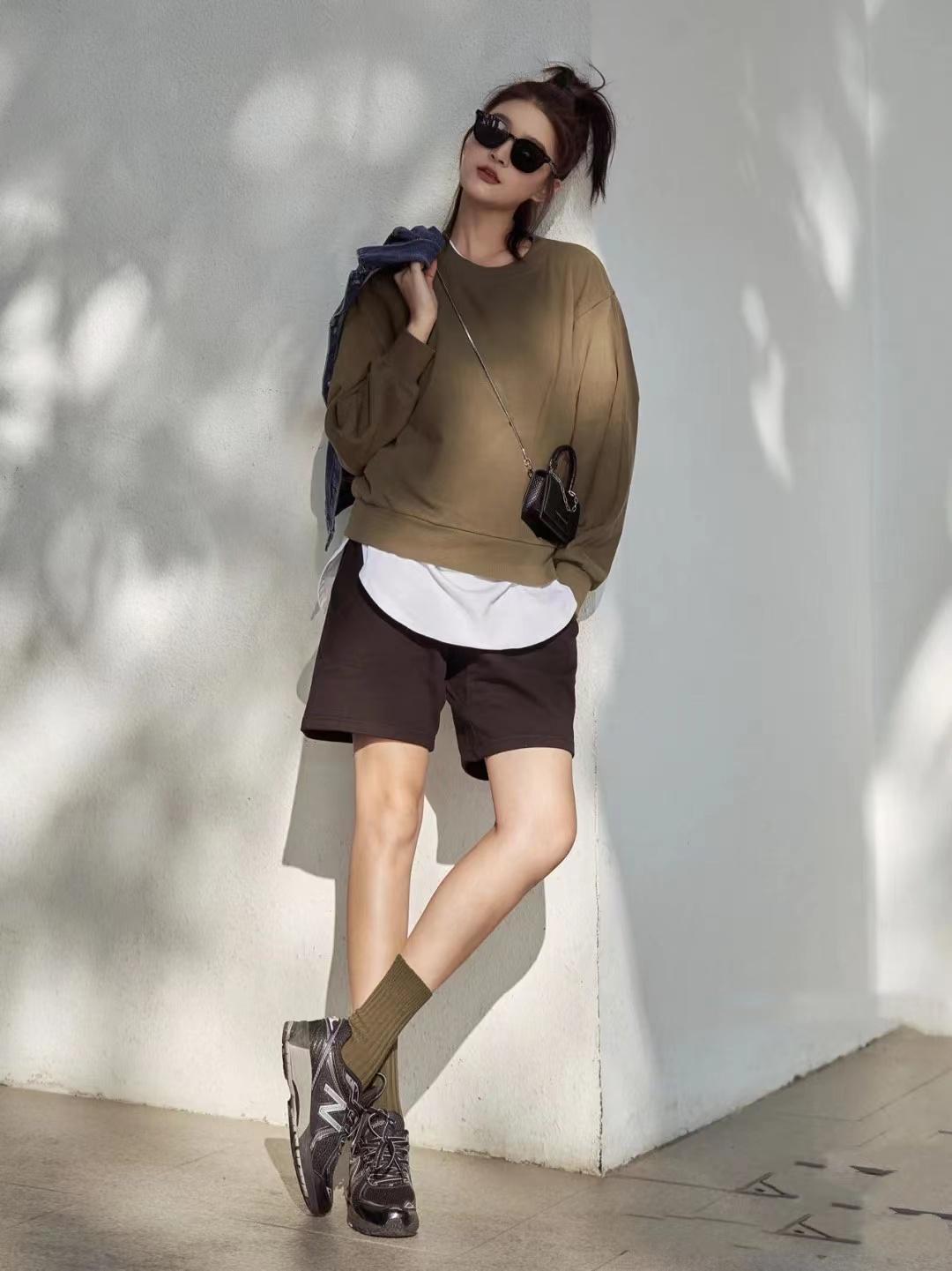 Sweatshirts can not only be paired with skirts, but also with trousers. If you are not a very tall girl, it is recommended to choose straight pants. Especially straight-leg trousers can better modify the shape of the legs and outline a more straight and slender effect. Choose the cut of nine-point pants, which is particularly refreshing and natural. Of course, if we want a high-end and handsome look, we can also pair it with floor-length pants, especially black floor-length pants, which can stretch the legs and make you look taller at the same time.