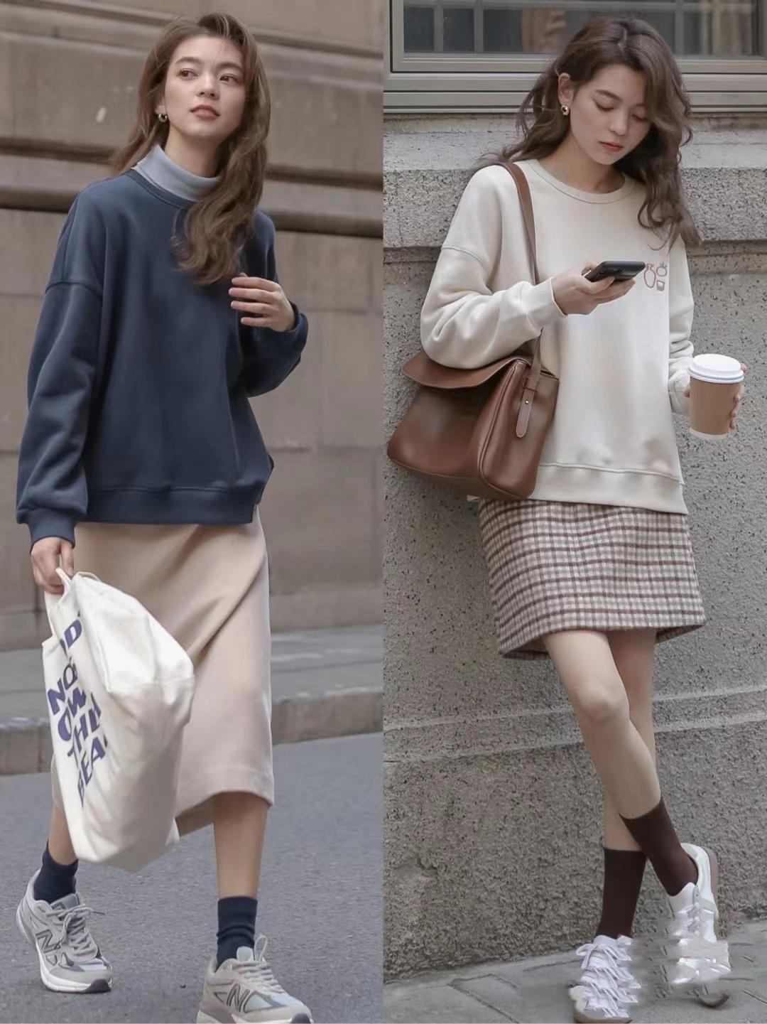Sweatshirts can be paired with straight skirts, half of them are casual style, usually gentle style, feminine Intellectuality and sweetness are expressed more naturally. This kind of combination is also very popular in spring, but when choosing a skirt, it is not recommended that you choose a design that is too tight. Appropriate looseness makes it more comfortable to wear and better matches the casual style of the sweatshirt. Paired with sneakers, it is full of energy, playful and age-reducing at the same time.
