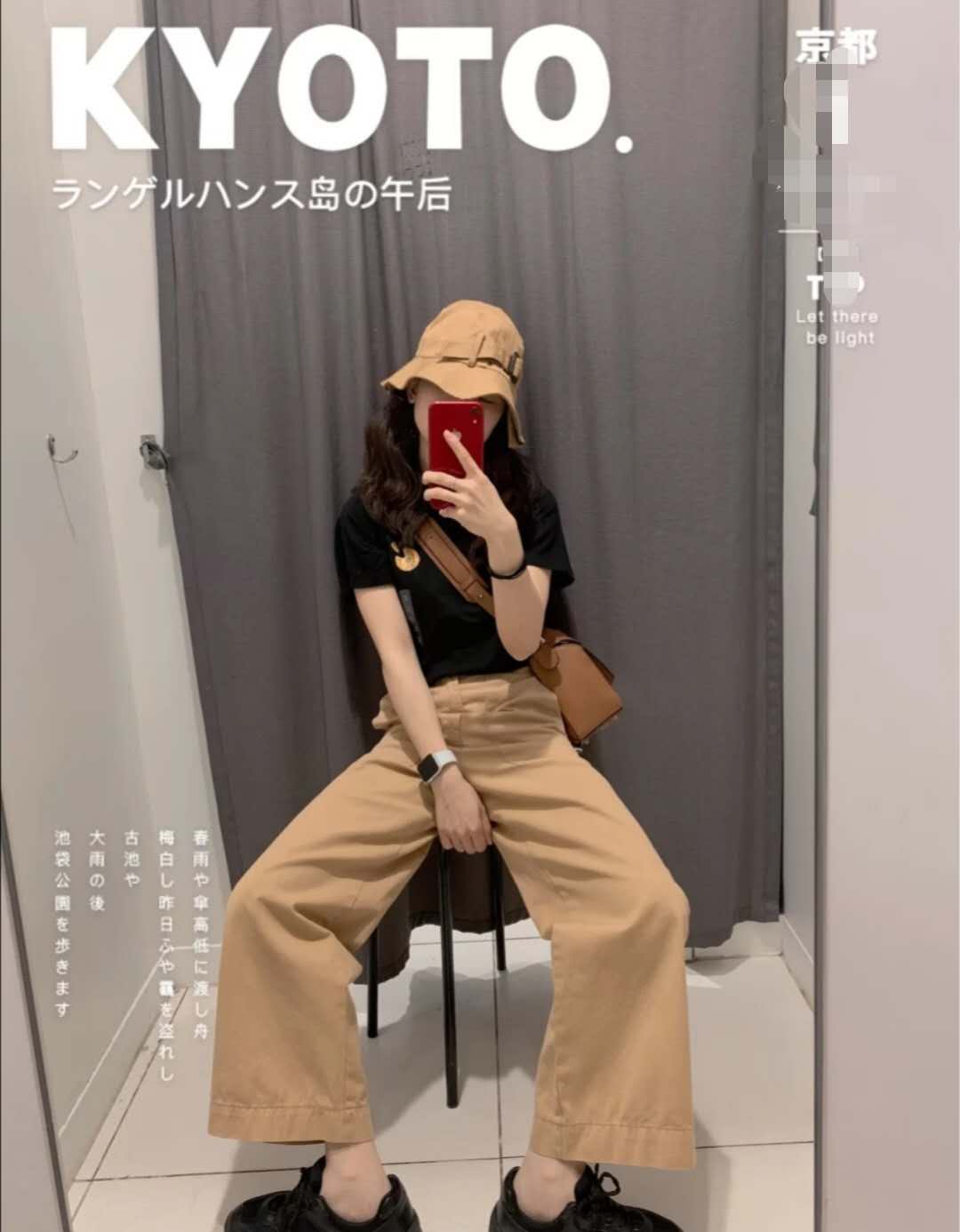 Black co-branded model T-shirt, really cute, simple Japanese style, khaki fisherman hat, very designed hat, you can also adjust the size through the strap on the hat, paired with khaki high-waisted straight pants, it especially shows white skin and temperament.