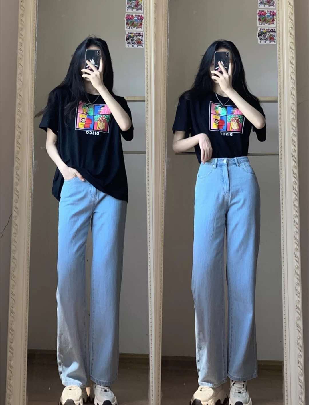 The one above the black T The four-frame interesting pattern print adds color to the black color. It is a clever combination of retro and trendy cool. The material is very breathable and will not be boring if worn in summer. I like this disco pattern, it is so cute. Blue wide-leg jeans are another pair of pants with a great fit. They make your legs look slimmer and longer, and they are not made of thick denim fabric. They are no problem to wear in summer and can completely cover up the shortcomings of your legs.