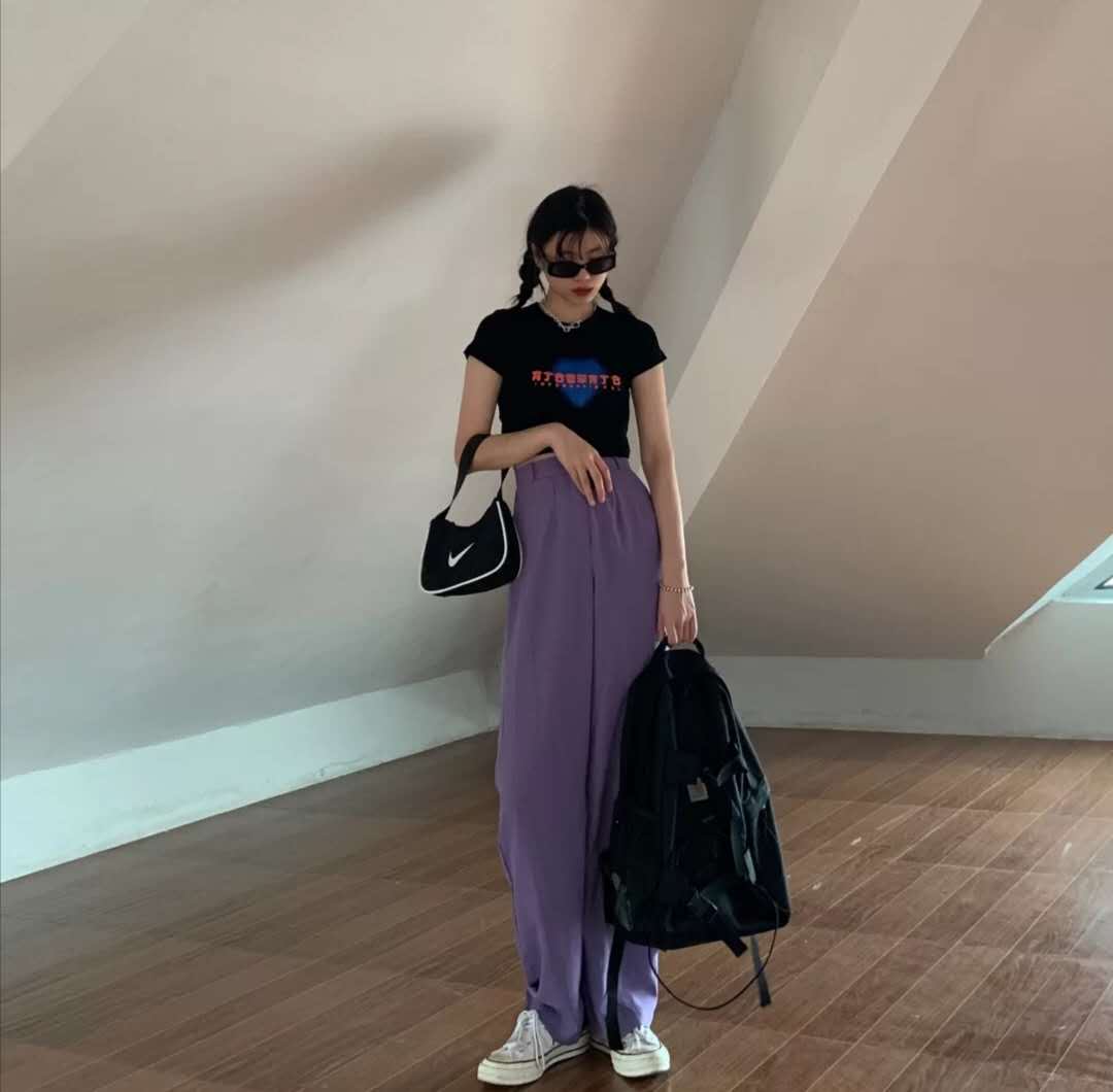 Short T matching, ordinary Pair a black t-shirt with super eye-catching purple pants. It’s not a boring combination, and it’s an outfit that will turn heads when you go out on the street.