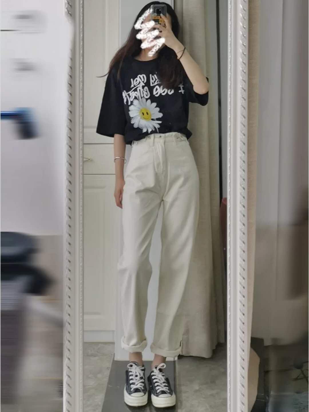 Off-white jeans fit too well It looks great, it flatters your legs and covers your crotch. You can wear it every day in summer! Paired with a black big daisy printed T-shirt, the black and white combination is simple, and the basic style looks fashionable.