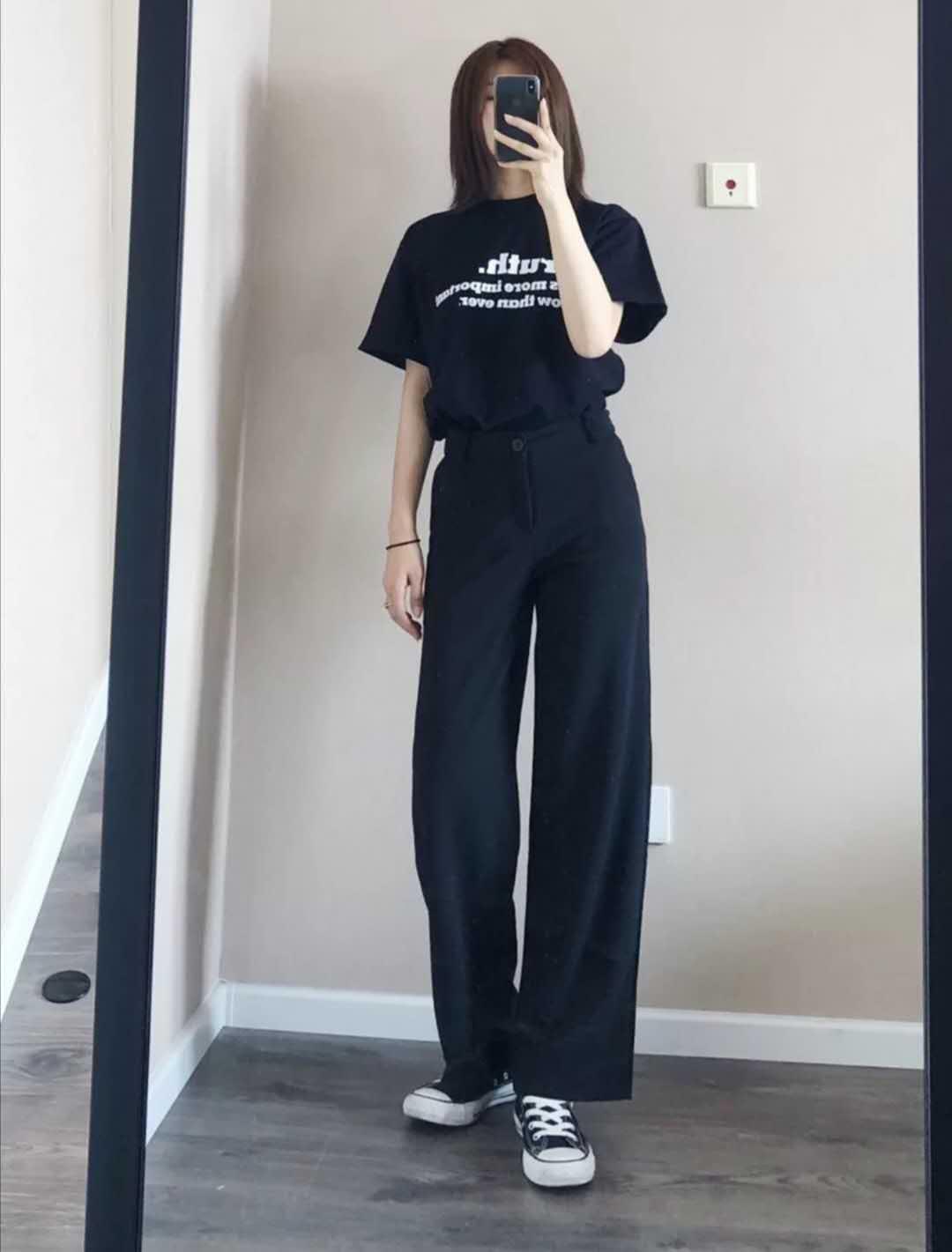 All black outfit, attitude T-shirt + black suit pants + canvas shoes. This kind of pants really reminds people of when they were about to graduate from college. Everyone was discussing how to buy professional attire. They look too much like office pants, so don’t wear leather shoes, otherwise you will pass by an office building. , will be sucked in to do the work!