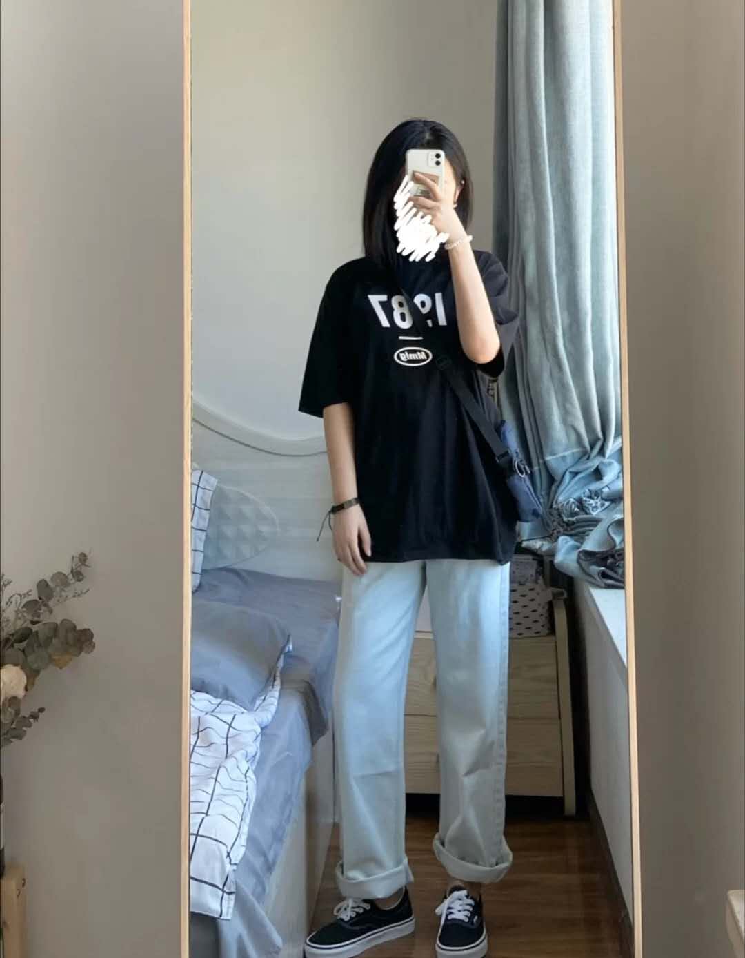 Like to be loose and unconstrained It feels like you can wear jeans directly under a loose black T-shirt and go out on the street. The pants are loose straight pants, the kind that are worn off, and can be rolled up or put down directly to wear. The style is super nice.