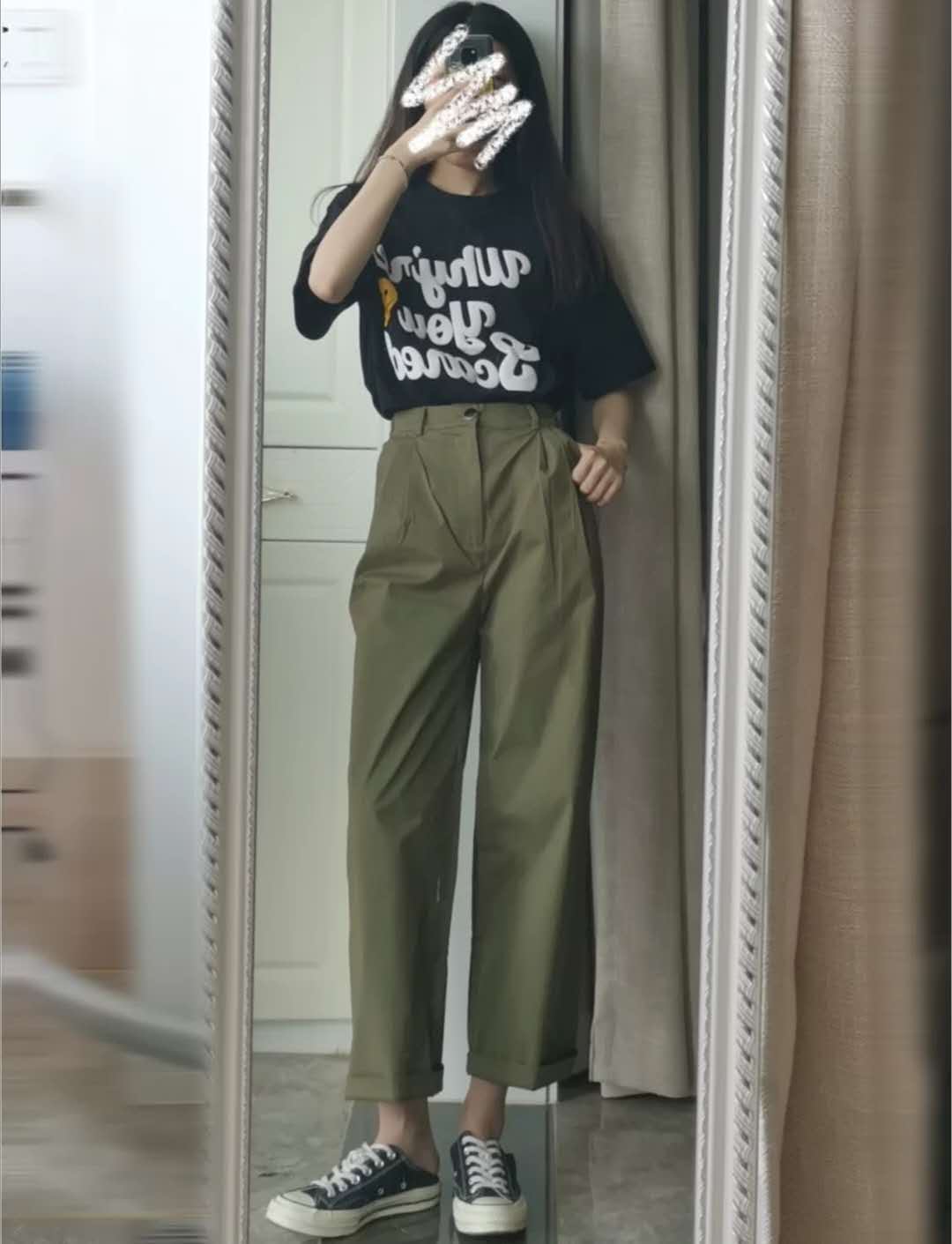 Black T-shirt fabric is super Comfortable, the letter print is also very special, and it matches wellI bought military green casual pants. The pants are made of pure cotton (it can be a little hot in summer), but they cover the crotch and have a good fit.