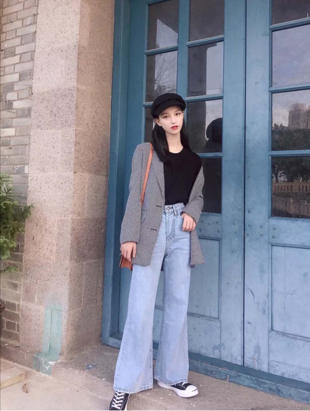 Black The T-shirt is used as a base, and paired with a small houndstooth suit jacket, it has a yuppie feel, and looks a bit like a plaid from a distance. The trousers are a pair of gradient denim wide-leg trousers with a flared hem, which has a full retro charm from the 1980s. When buying pants, be sure to buy high-waisted ones to make your legs look longer. Wear a pair of black canvas shoes, carry a small brown square bag for a more casual look, and take off your jacket to look youthful.