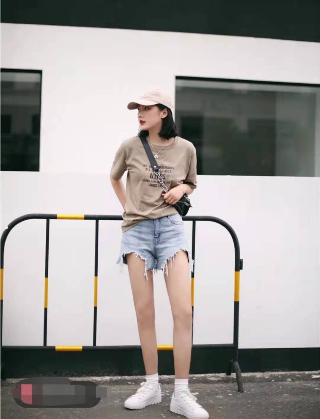 look3 Light brown T-shirt + blue denim ripped shorts + white shoes