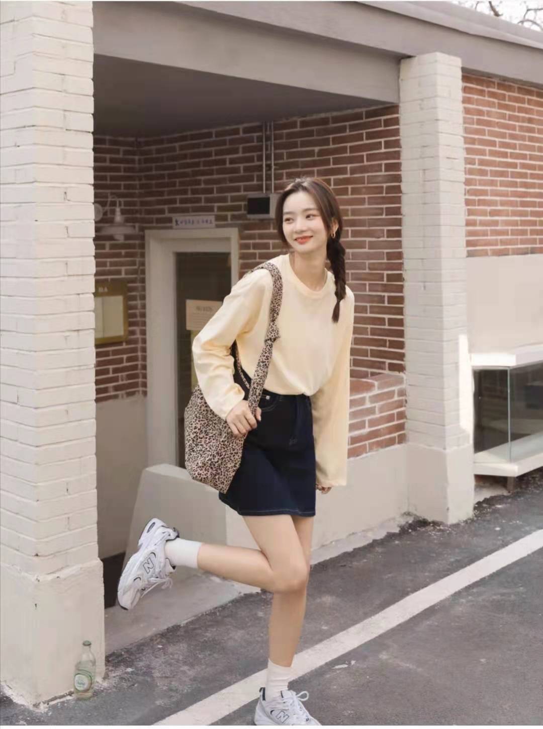 look2 Yellow pullover T-shirt + dark blue denim skirt + white sneakers