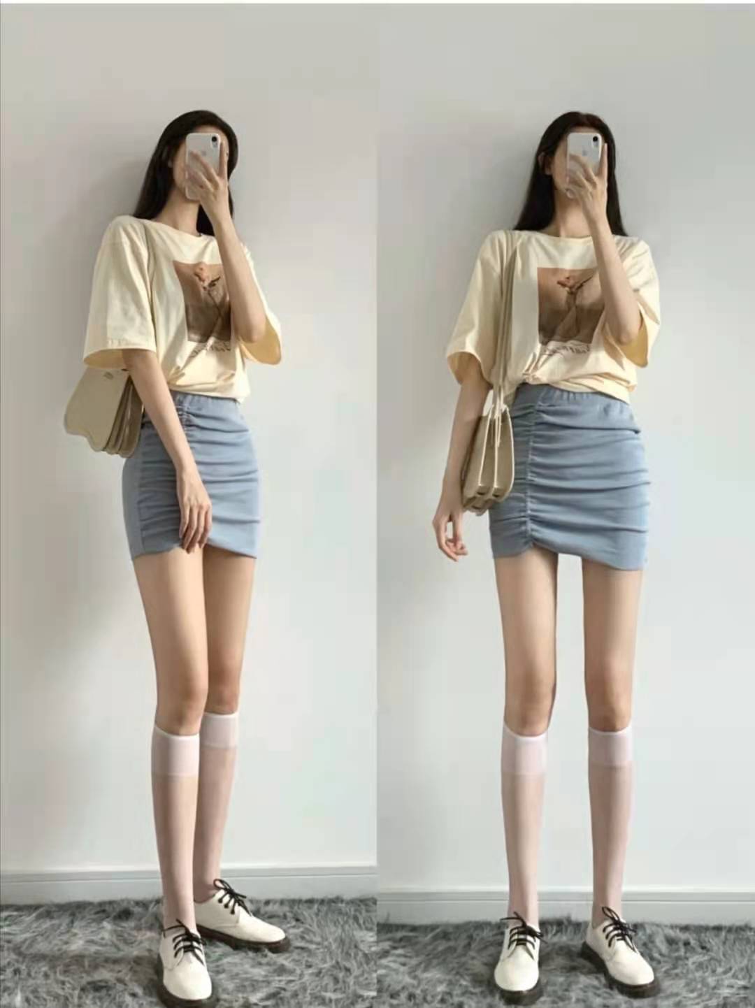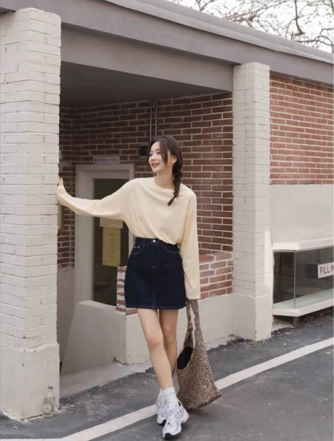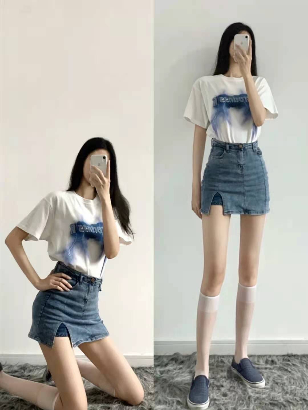 The T-shirt is lightning cool. I really like the detailed design of the print. It is a bit thick cotton. I like the texture. The blue print goes directly with skirts/trousers. The color matching is perfect. This denim skirt It’s very comfortable, super elastic, and there’s no pressure when you squat or stand up. It has a separate pair of shorts underneath, which makes it very safe to wear when going out.