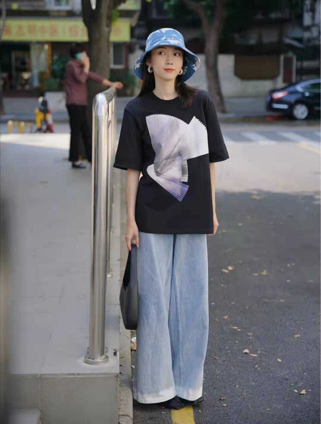 Relatively simple daily wear: This white printed T-shirt looks really good when paired with light blue jeans. I didn’t realize how unique it was when I bought it before, until I paired it with light blue jeans. Jeans, just one word, absolutely