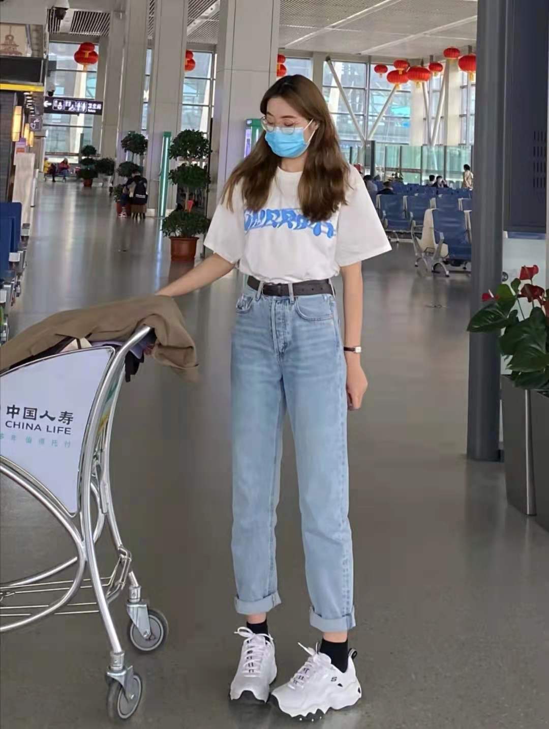 look1 white printed T-shirt + blue denim slim straight pants + white dad shoes