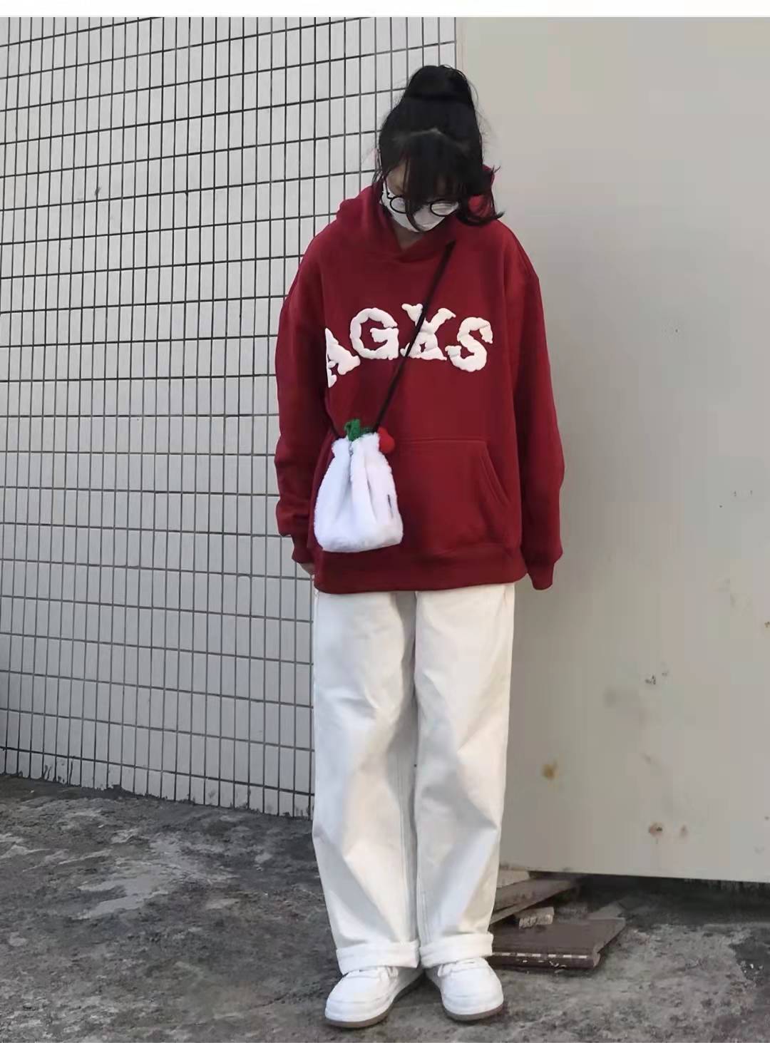 Red sweatshirt matching:Everyone who sees this outfit praises how beautiful it is, and it is very flattering. It is very suitable for the New Year! The top is a red hooded casual pants and sweatshirt jacket. The simple white letter design is fashionable and elegant. The lower body is paired with white wide-leg pants and white shoes. The matching combination is very simple and elegant.