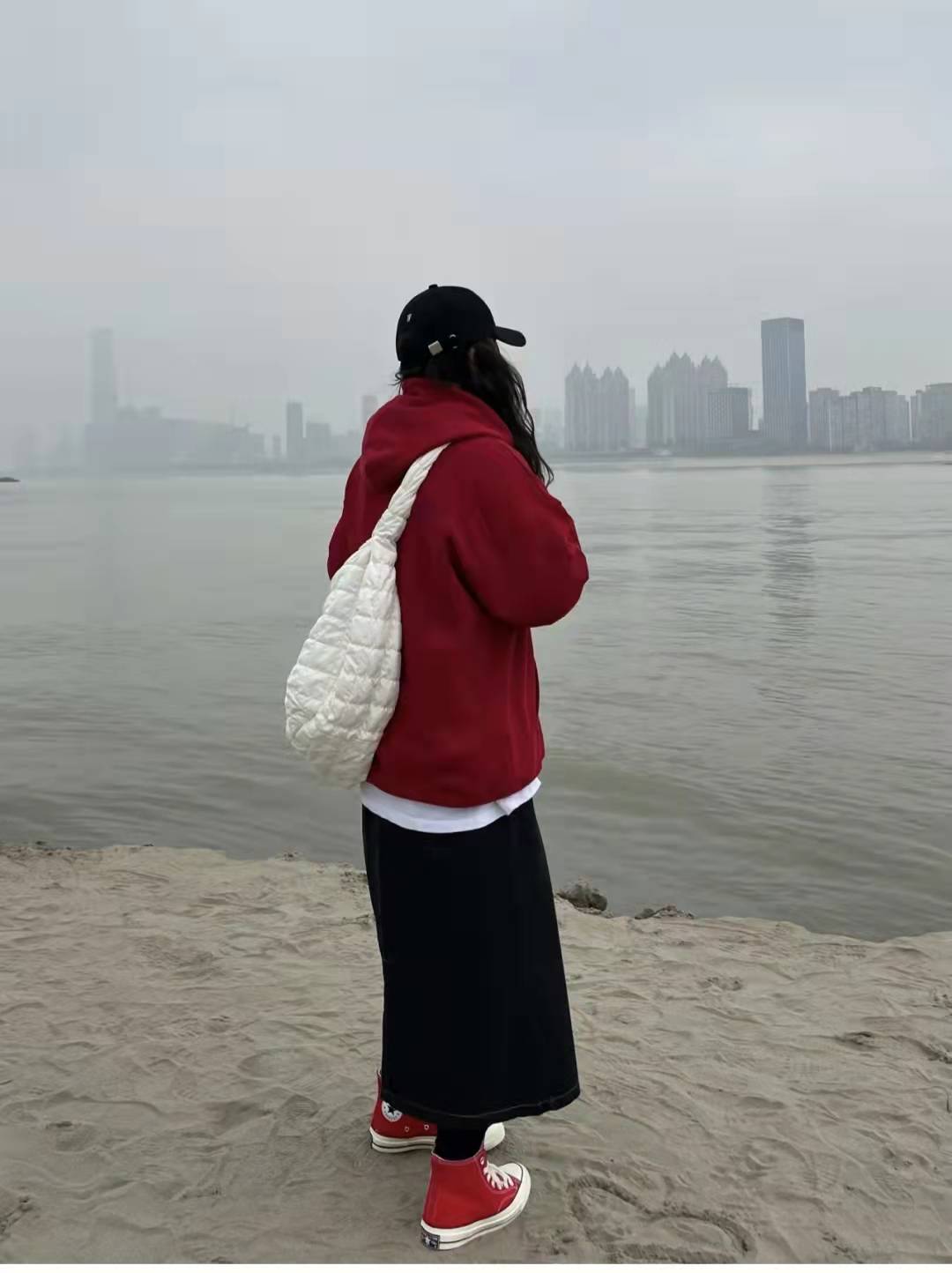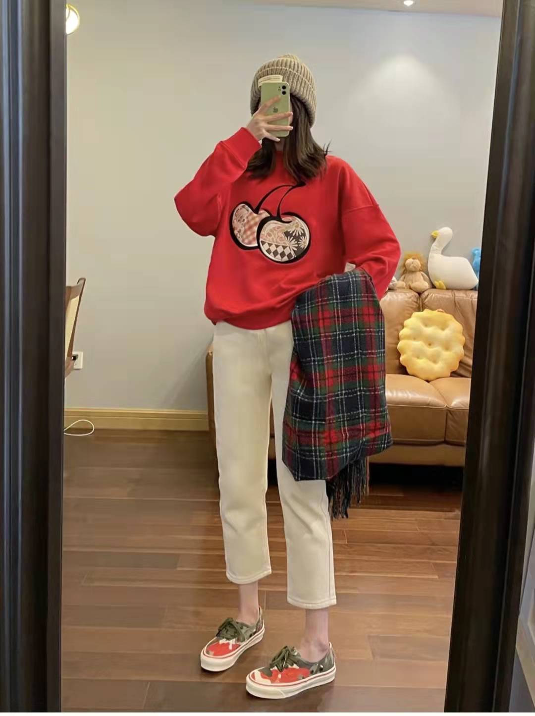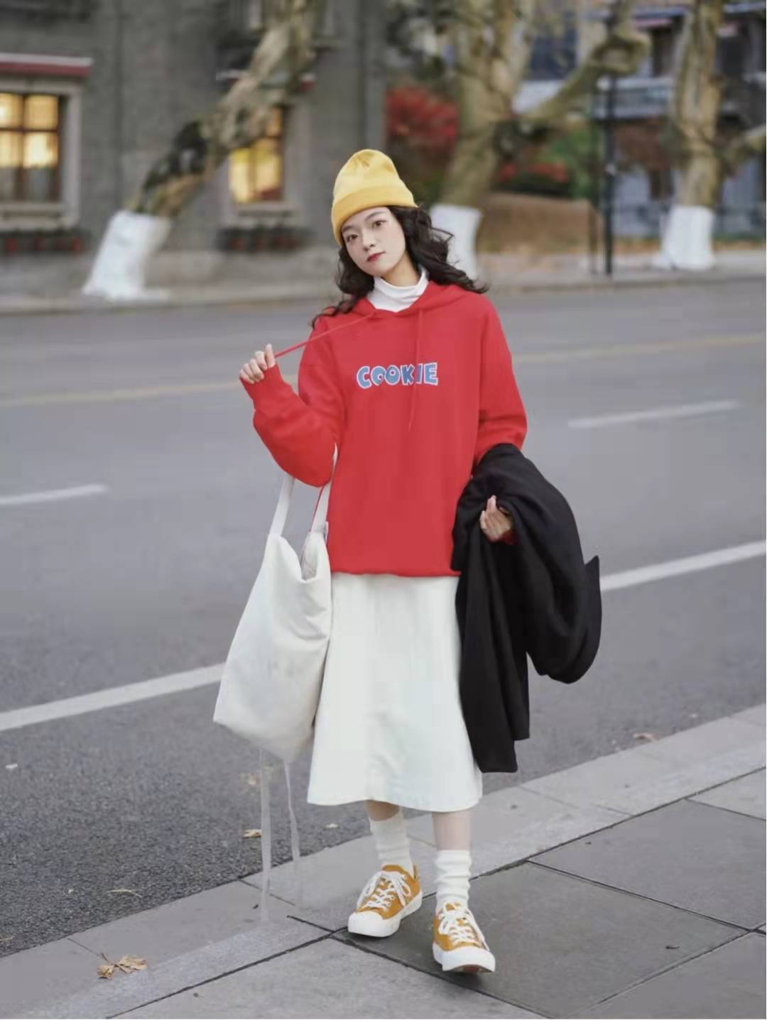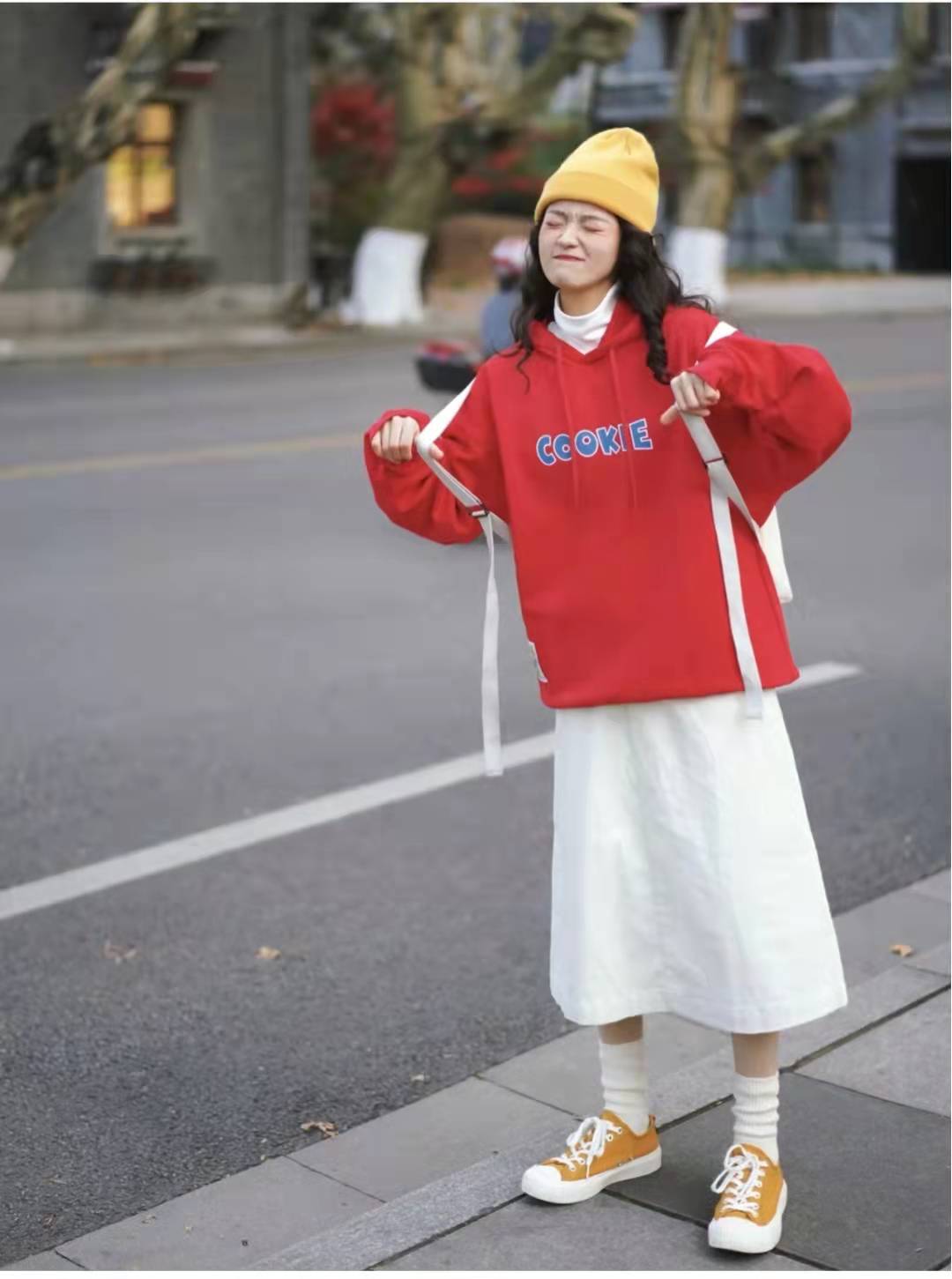 Red sweatshirt matching:The color of the red sweatshirt is perfect for the New Year! The cookie pattern is super cute, the sweater is of good texture and comfortable to wear, and it can be worn alone or as an inner layer. Wearing a white turtleneck base, a white skirt on the lower body, white socks and bright canvas shoes on the feet, this outfit is very suitable for the early spring season.
