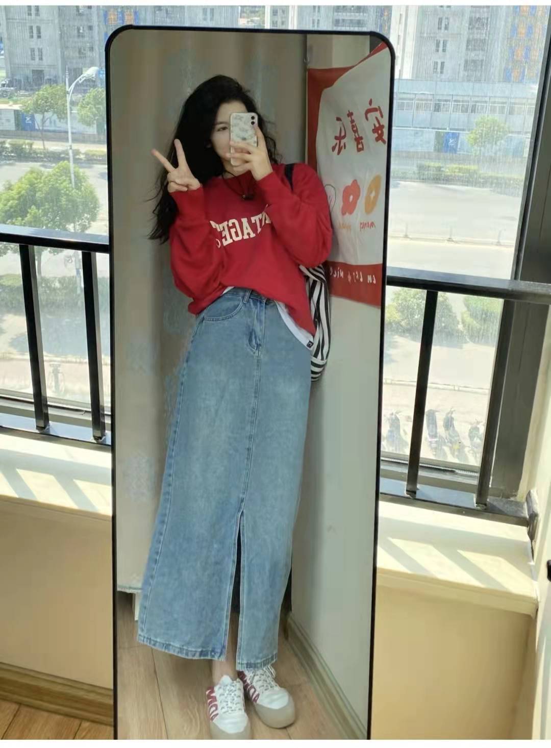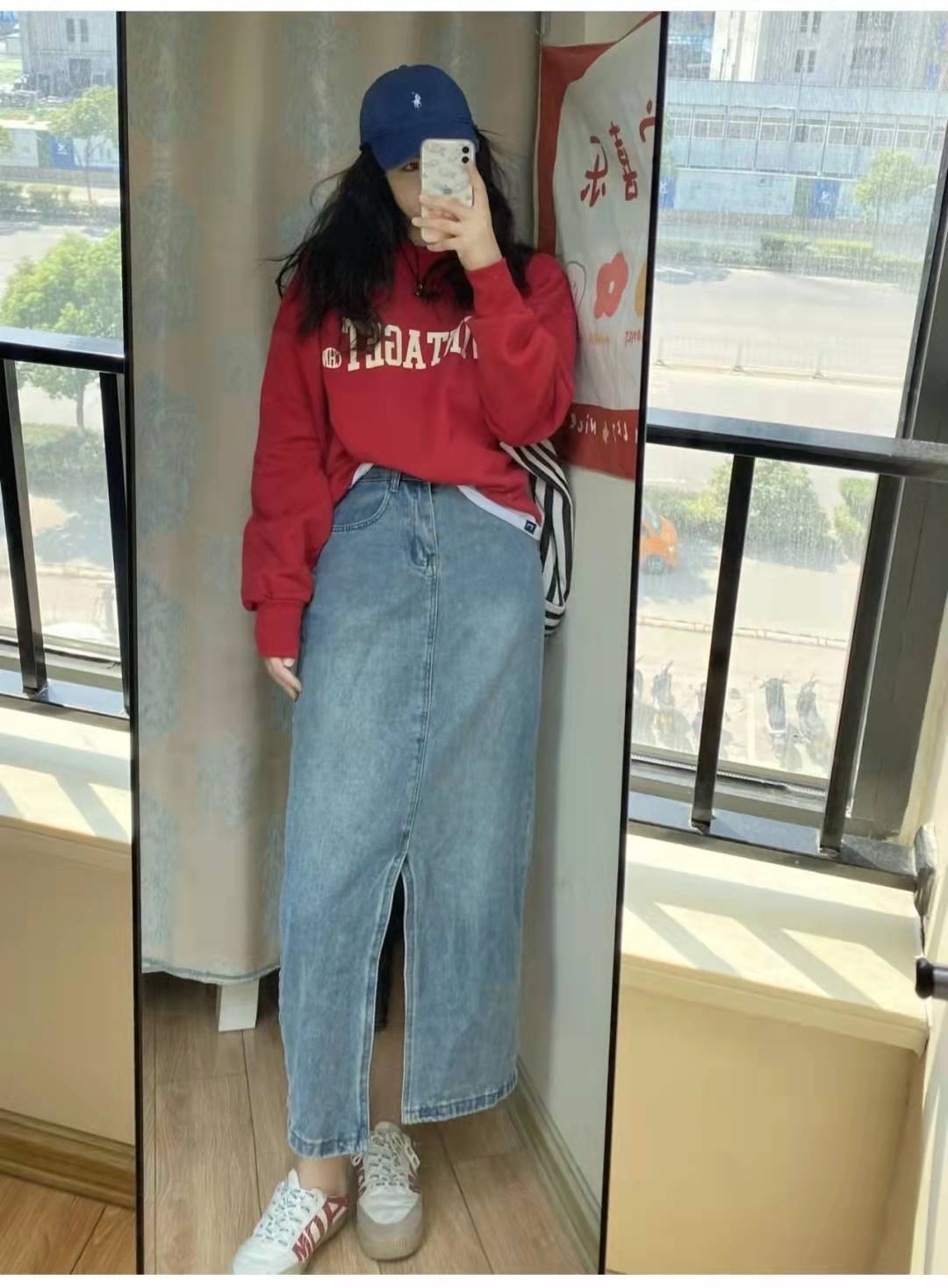 Red sweatshirt matching: This outfit is very suitable for the spring season. The top is a red round neck sweatshirt. The loose fit + letter print design is full of Korean style. , with a white T-shirt underneath, a washed blue high-waisted denim skirt and sneakers on the lower body, and a baseball cap to go to the park.