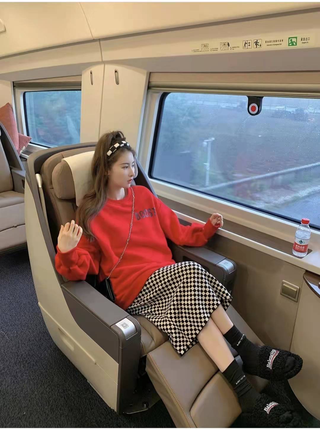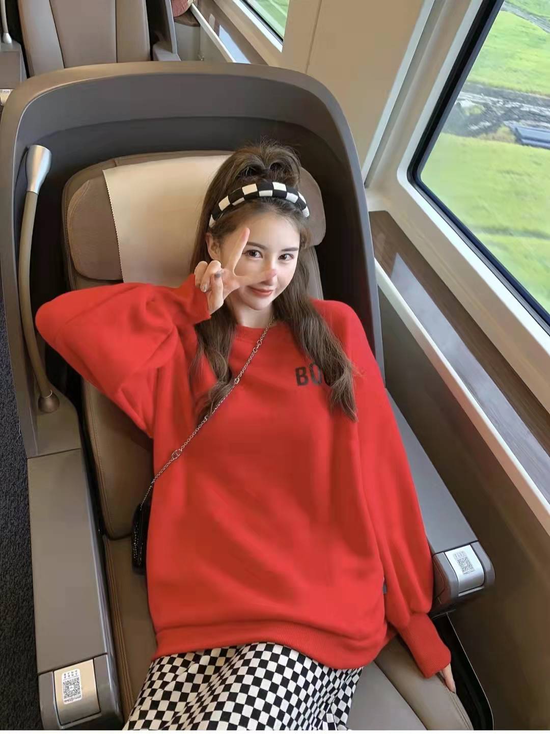 Red sweatshirt matching: I thought I couldn’t control this red sweatshirt, it smells so good when I wear it! It makes the person look brighter and brighter, and the person wearing it is very energetic. Pair the lower body with a fashionable checkerboard skirt and black furry shoes, creating a comfortable travel look.