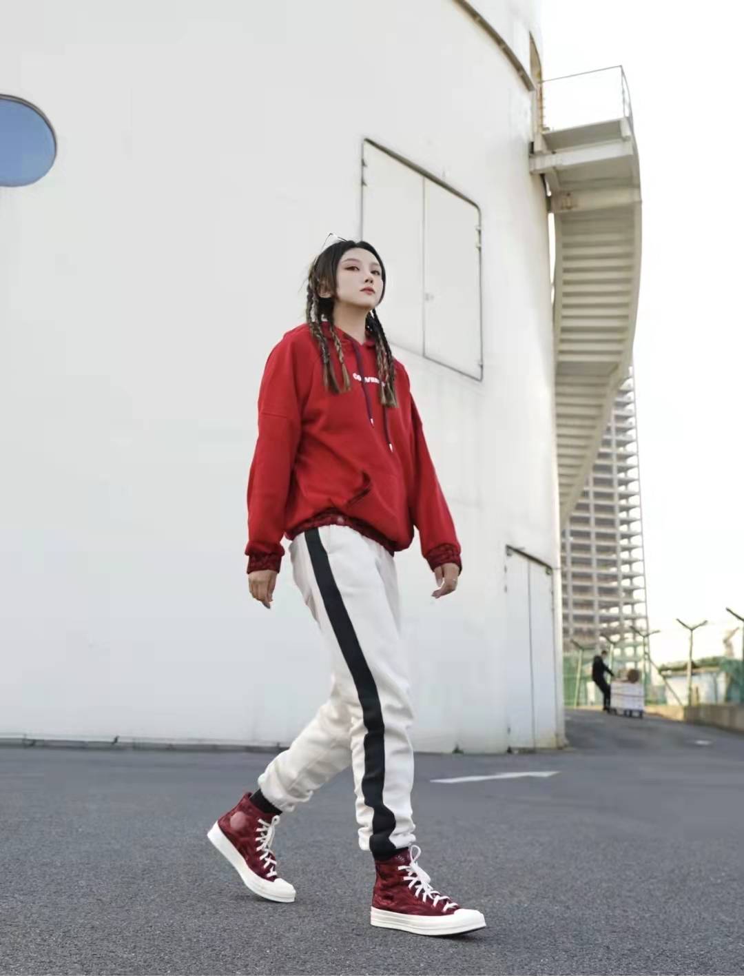 Red sweatshirt matching: arranged a set for the Year of the Tiger A super cool single look, a red sweatshirt paired with shoes with tiger print elements of the same color! The red sweatshirt is a casual style with a hood. The upper body is particularly white. The tiger print elements on the sleeves echo the shoes. The details are perfect! Pair the lower body with white sports pants. The black edge design of the pants is very fashionable and reduces your age. A cool outfit is perfect for sisters with personality.