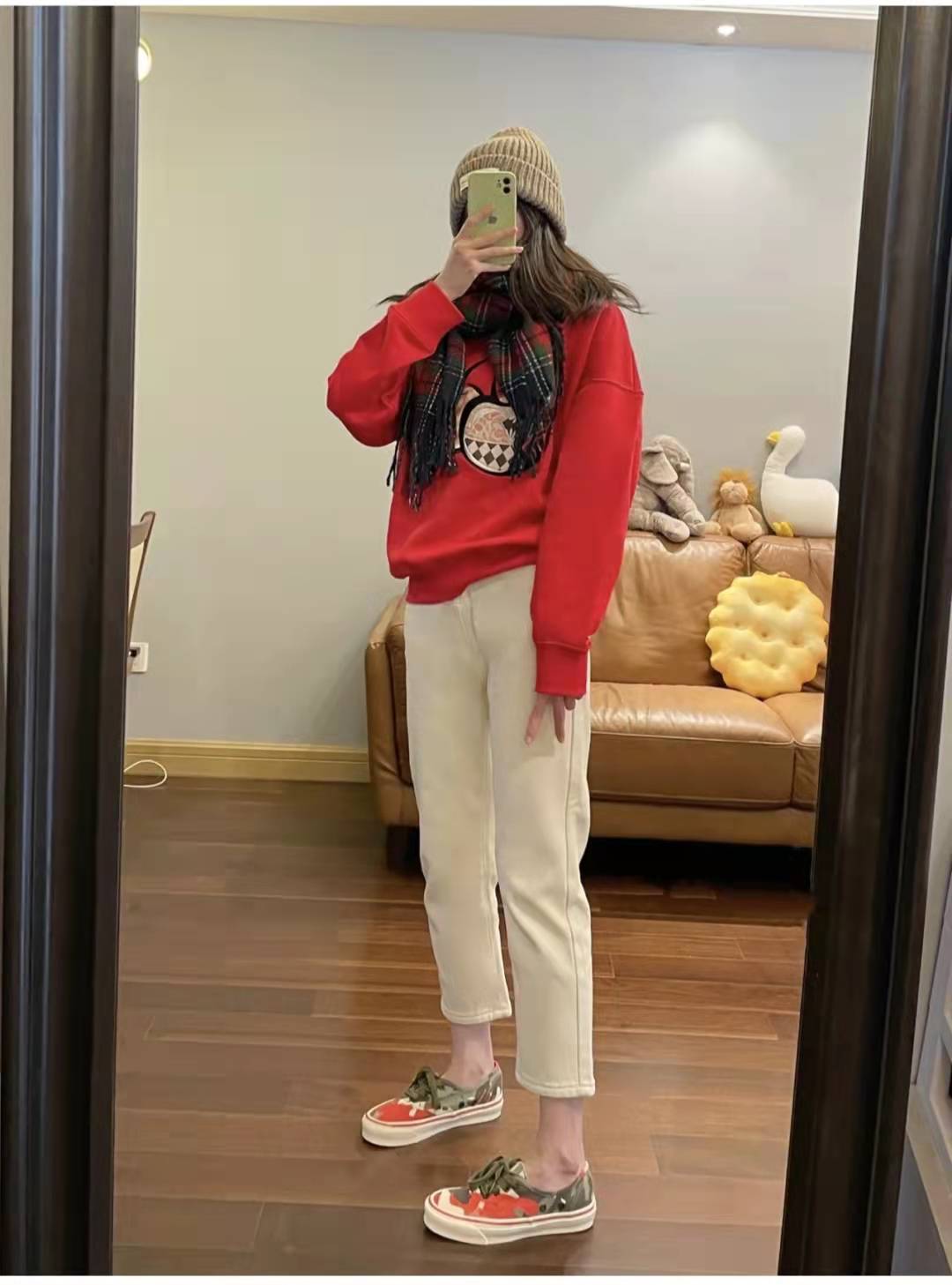 Red sweatshirt matching: this oneIt is a red outfit, which is very suitable for the spring atmosphere, so I chose a super festive red sweatshirt with a thin layer of velvet. It is also good for inner wear in autumn and winter, or Wearing outside in early spring will have a high rate of turning heads. The lower body is paired with white eight-point straight jeans and red sneakers. The outfit has a strong Spring Festival atmosphere.