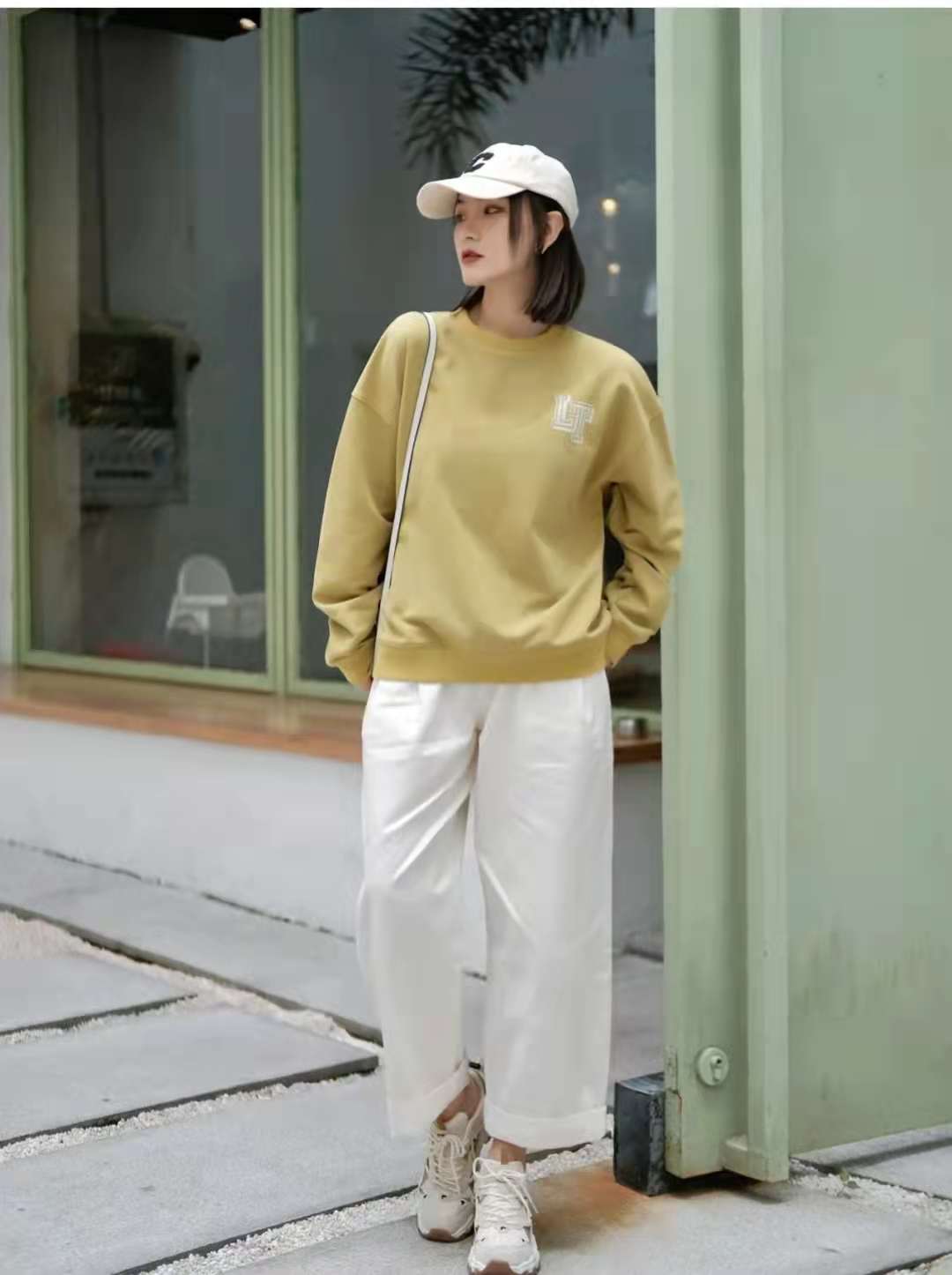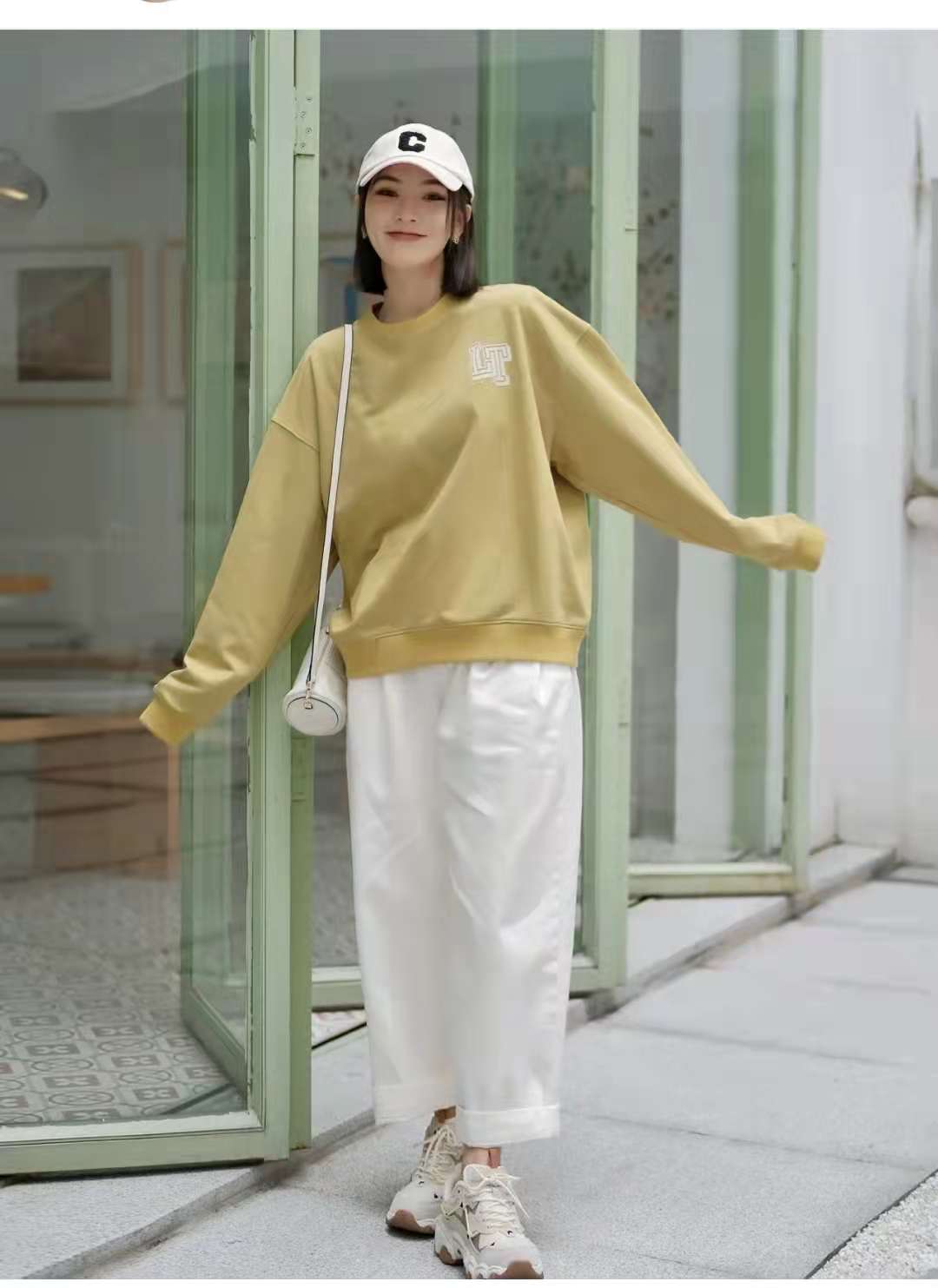 Sweatshirt outfit:Of course spring is indispensable without the sweatshirt look. The fresh yellow-green color is like wearing spring on the body. The loose basic version is suitable for outer wear or inner wear. I like this. A minimalist design, paired with a pair of wide-leg jeans, the off-white color is perfect for spring, and the off-white shoes and hats of the same color are both casual.