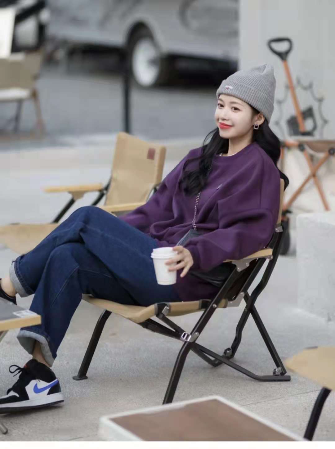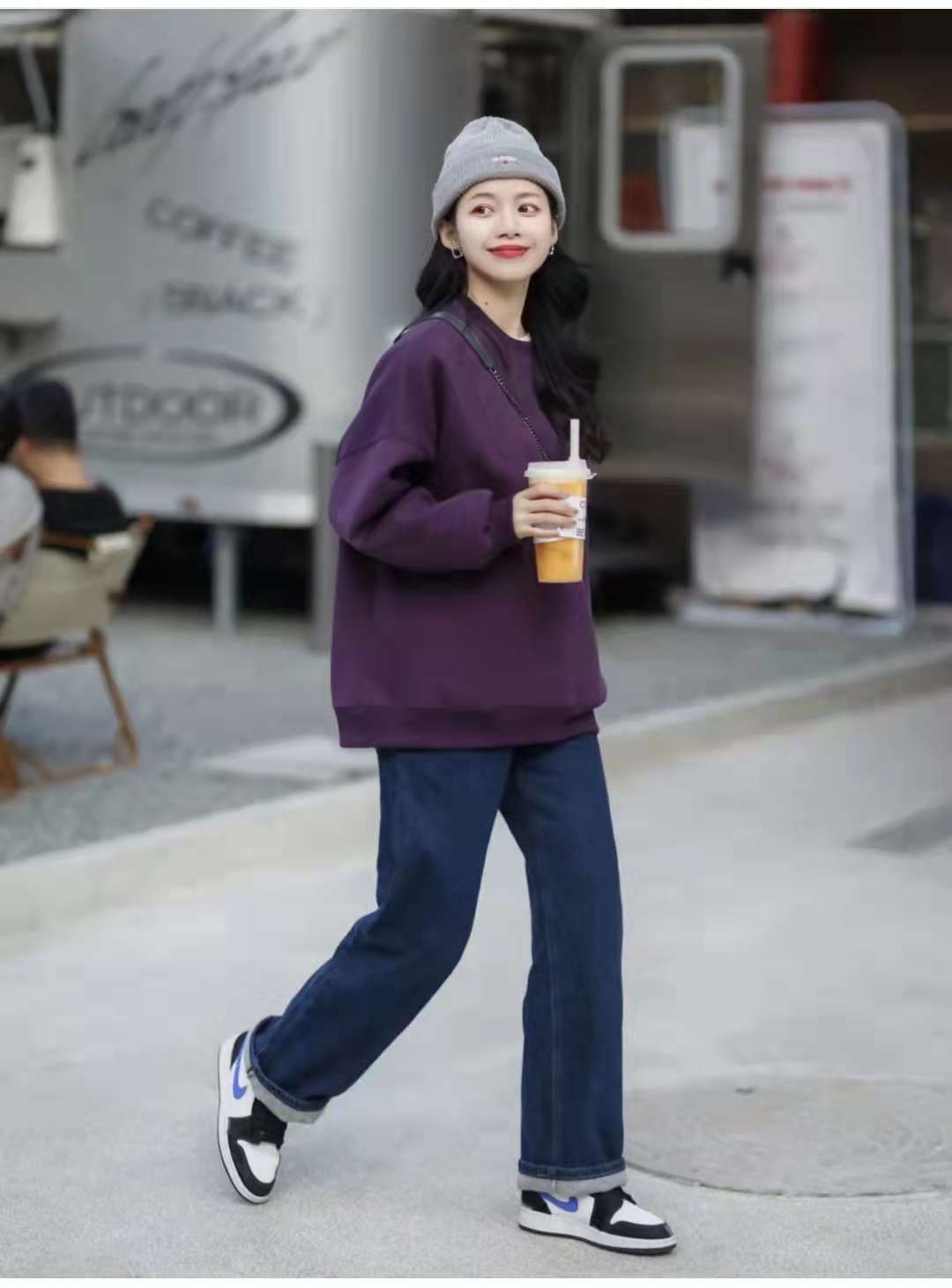 Sweatshirt outfit:Purple is really an irresistible color combination. I added a grape purple plain round-neck sweatshirt. I thought it was too monotonous, so I added it. A bape brooch, dark blue wide-leg jeans paired with Aj of the same color, and a gray cotton hat are also a perfect match.