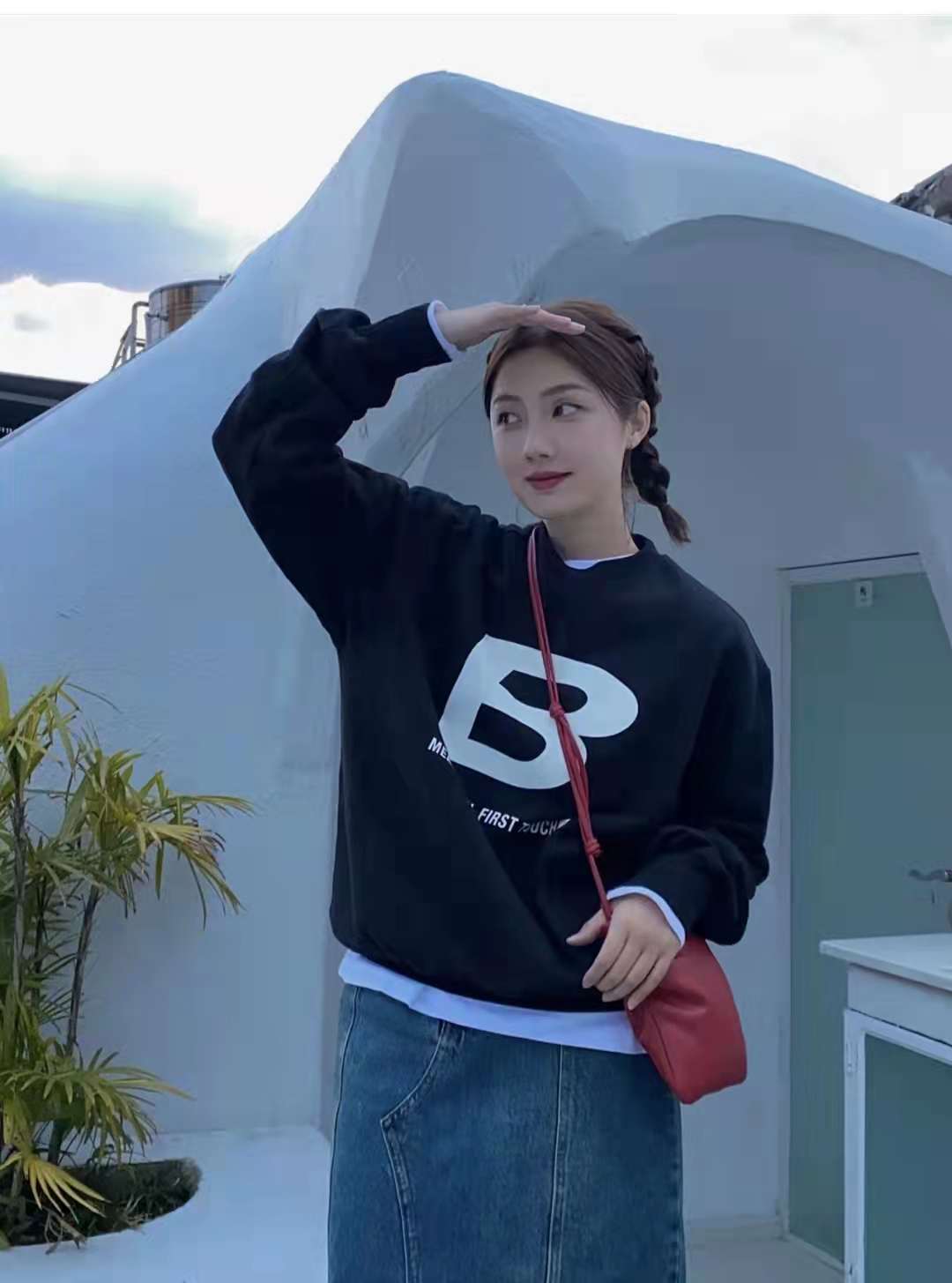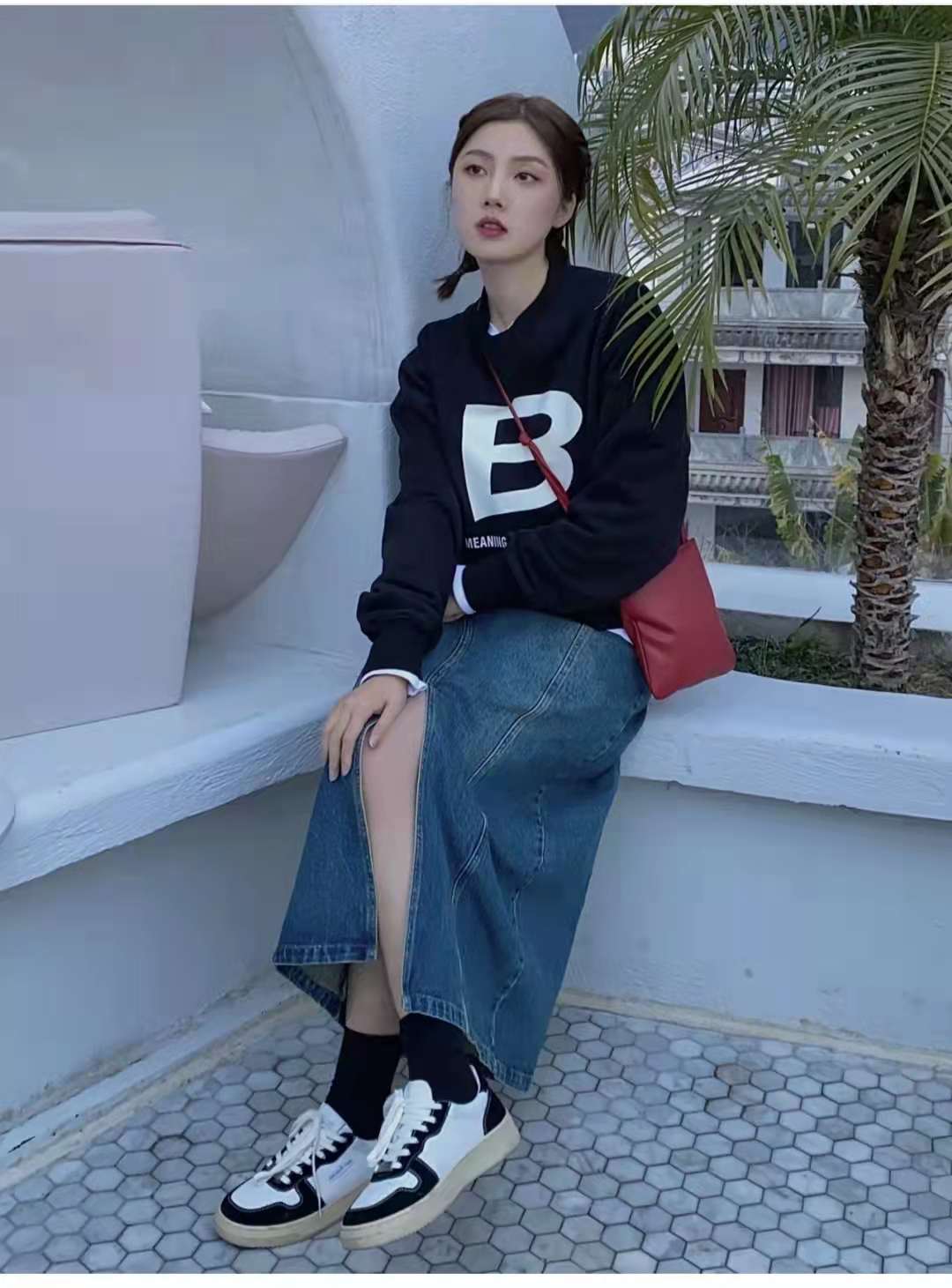 Sweatshirt outfit:How can you wear a spring outfit without a sweatshirt and a skirt? Who doesn’t love a casual and age-reducing outfit? The black sweatshirt with this look has a fashionable letter B print. It is paired with a white T-shirt to increase the visual sense. The lower body is paired with a blue denim slit skirt and sneakers. The set is fashionable and eye-catching when going out on the street.