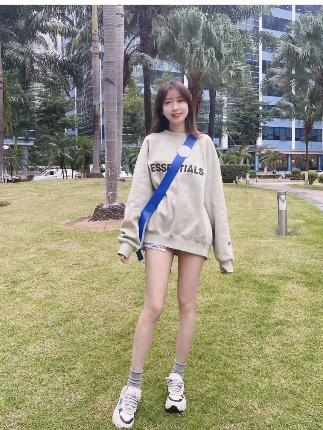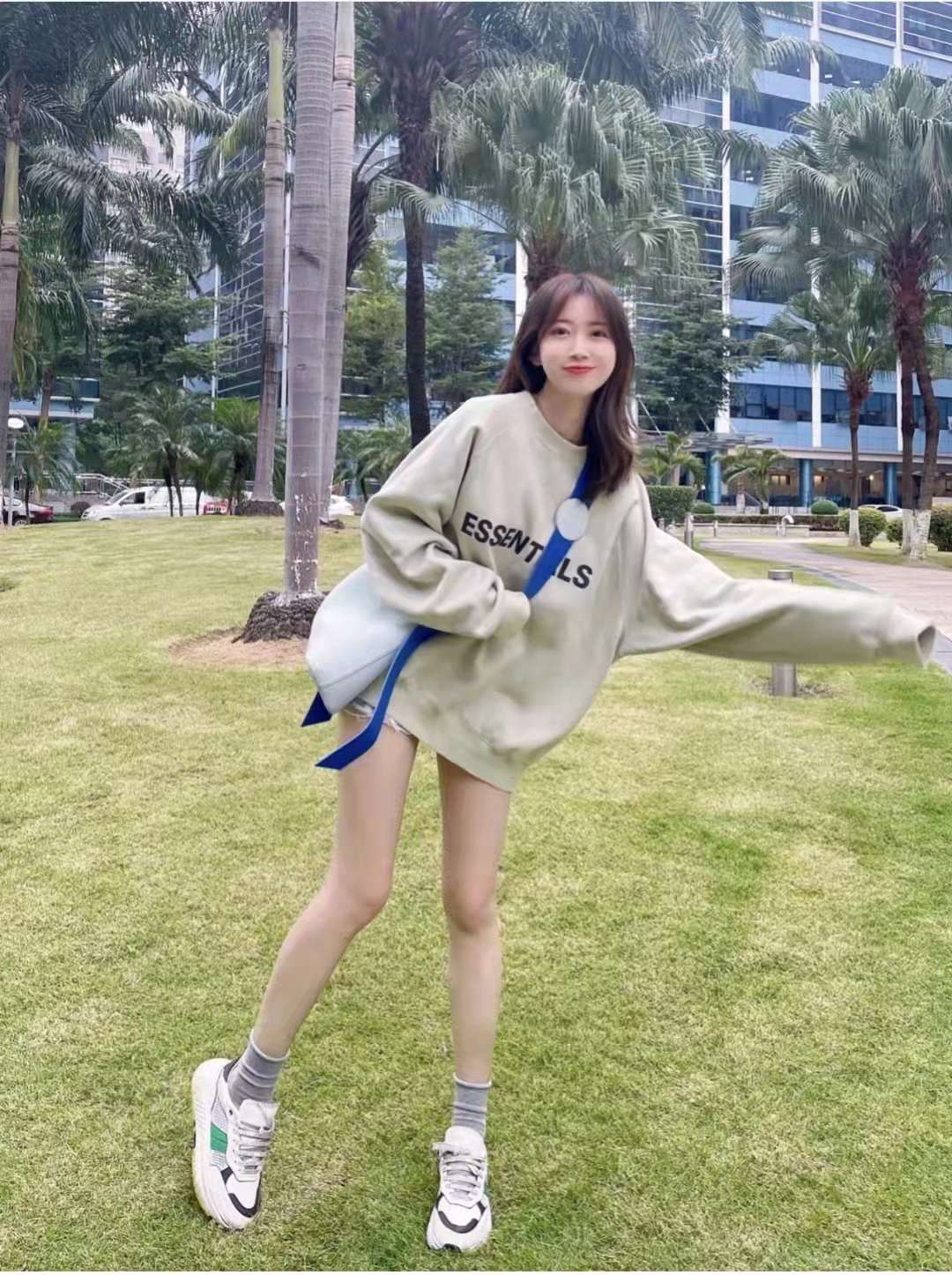 Sweatshirt outfit:If you don’t want to wear too bulky clothes, the combination of sweatshirt + socks + sneakers is a must-have for high-street girls; the length of the socks to the calf makes you look thinner and taller. , the length of the sweatshirt is just below the shorts, the sage green color matches the bag I just received recently, it looks good and trendy! The whole look is instantly highlighted.
