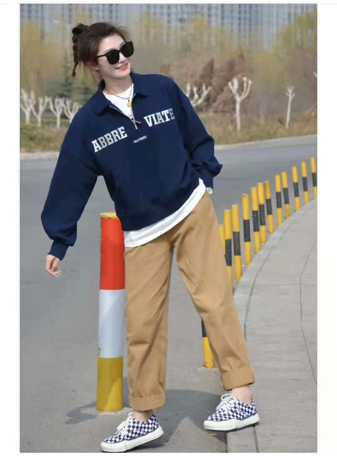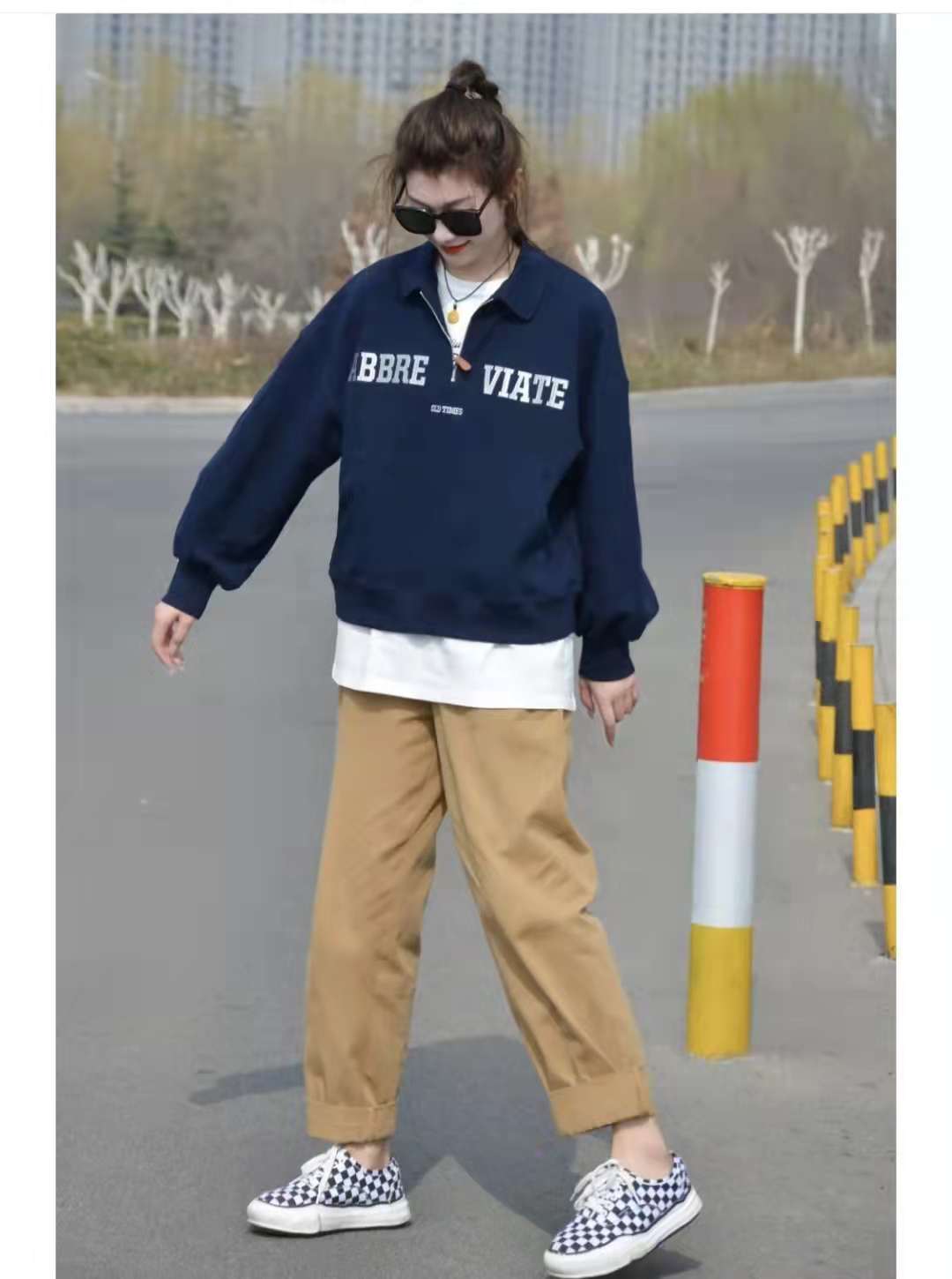 Sweatshirt outfit: This is a comfortable outfit. The top is a dark blue pullover sweatshirt. The zipper design of the clothes can freely adjust the neckline. The simple white letter design on the chest is simple and fashionable. , wearing a white T-shirt underneath naturally exposes the hem to enrich the look. The lower body is paired with khaki casual pants and checkerboard canvas shoes. A blue + khaki set is stunning.
