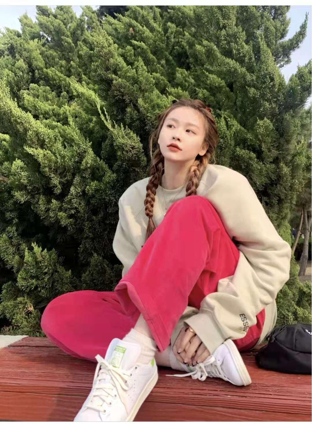 Sweatshirt outfit:The mustard green sweatshirt is so spring-y. I prefer mustard green to those gray, gray, and brown colors. It is the color of a spring sweatshirt, paired with retro corduroy. Rose pink pants + white shoes are so beautiful