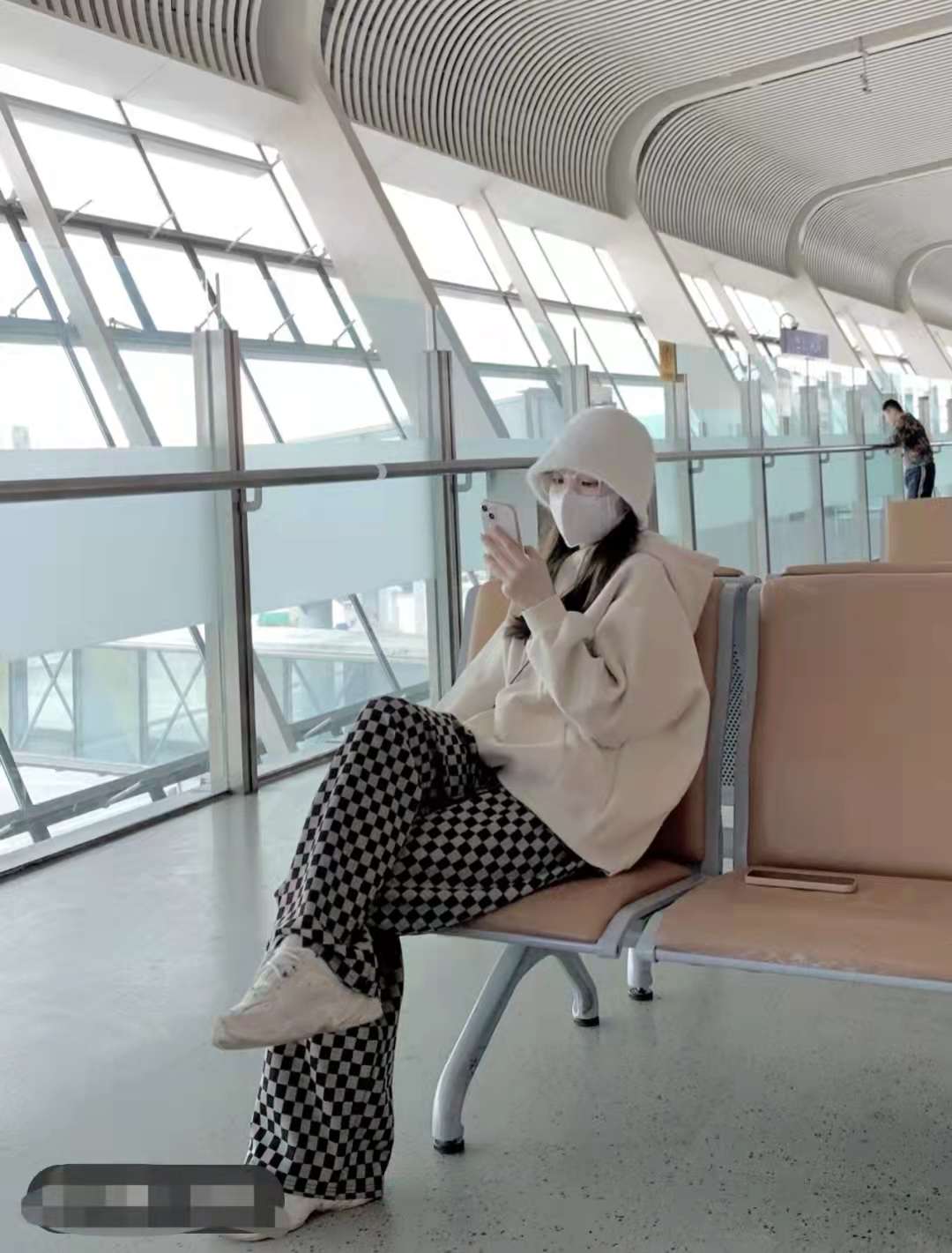 Sweatshirt outfit:Airport wear is always about comfort. The first choice is a sweatshirt + loose pants. The cream-colored sweatshirt is really gentle, coupled with the checkerboard pattern wide-leg pants with a western style. , a set of photos taken at the airport is full of Instagram style.