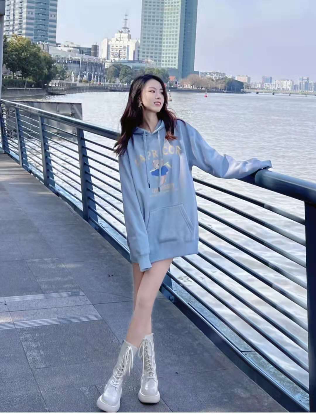 Sweatshirt outfit:Wearing blue in early spring is super white. Blue is the color of spring and gives people a feeling of vitality! The large version is most suitable for those with missing lower body, making the legs appear slim and long! The clothes have a hooded design + letter print pattern, which is both age-reducing and fashionable. The shoes are also silver mid-calf Martin boots. One set is very special when going out on the street.