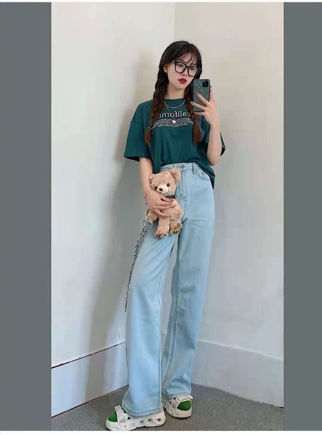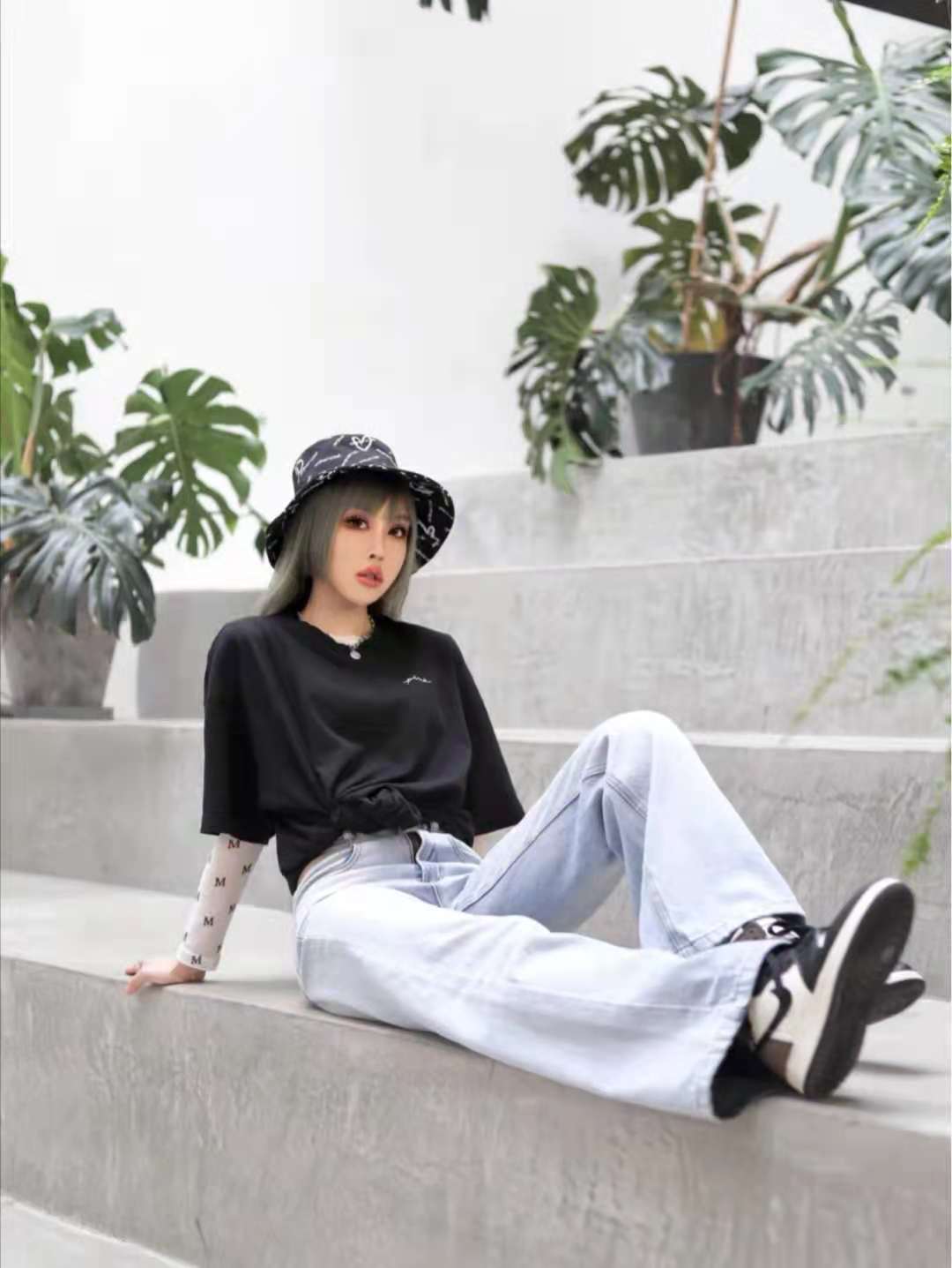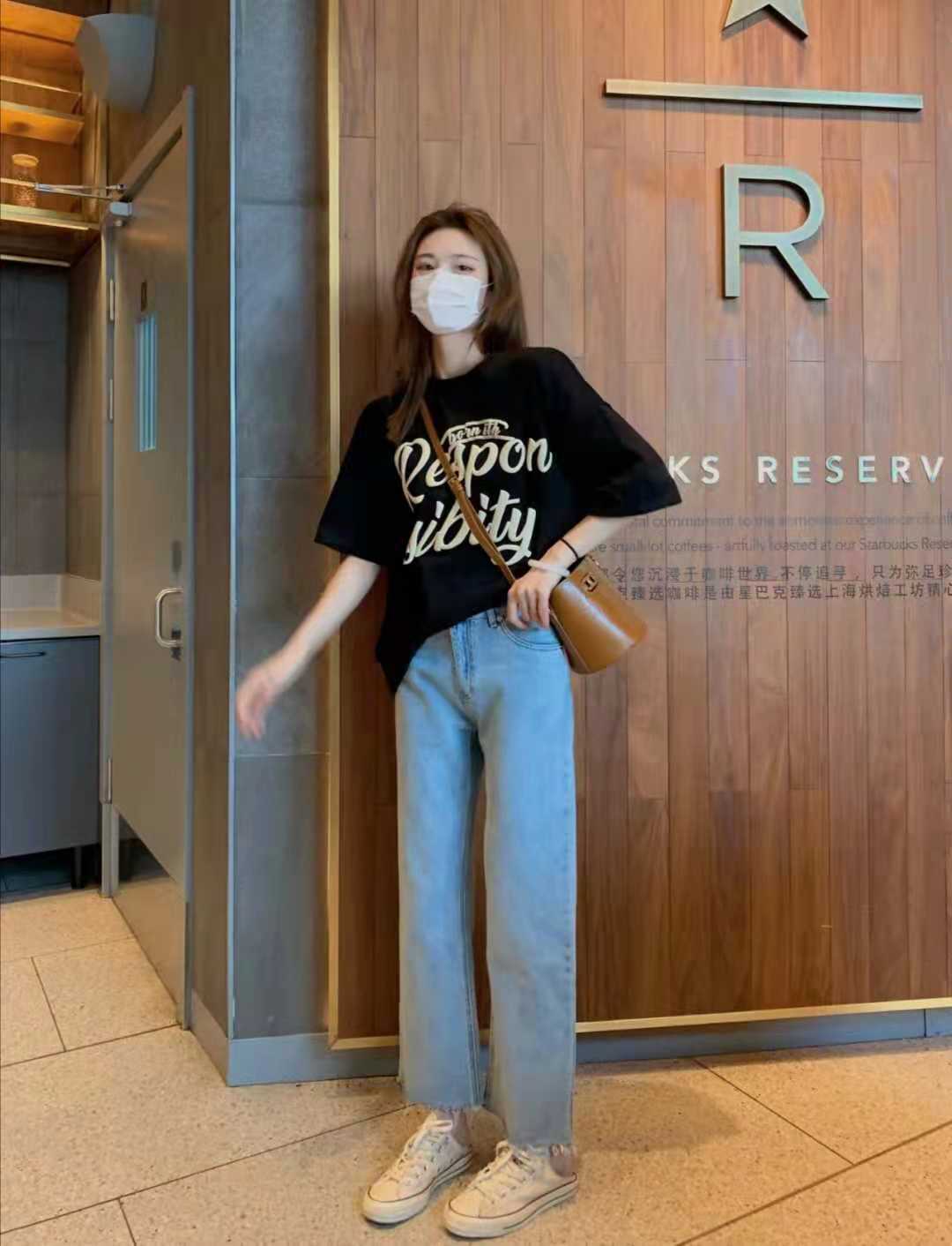 Jeans and T-shirt outfit: This outfit is the simplest T-shirt and jeans, classic, good-looking and not unattractive. The foamed characters on the T-shirt are the highlight. The black color is basic and versatile, and there is also a light blue straight leg. Jeans are so straight-legged, the color is beautiful, the shape of the pants is amazing, and the price is not high, which is great value for money!