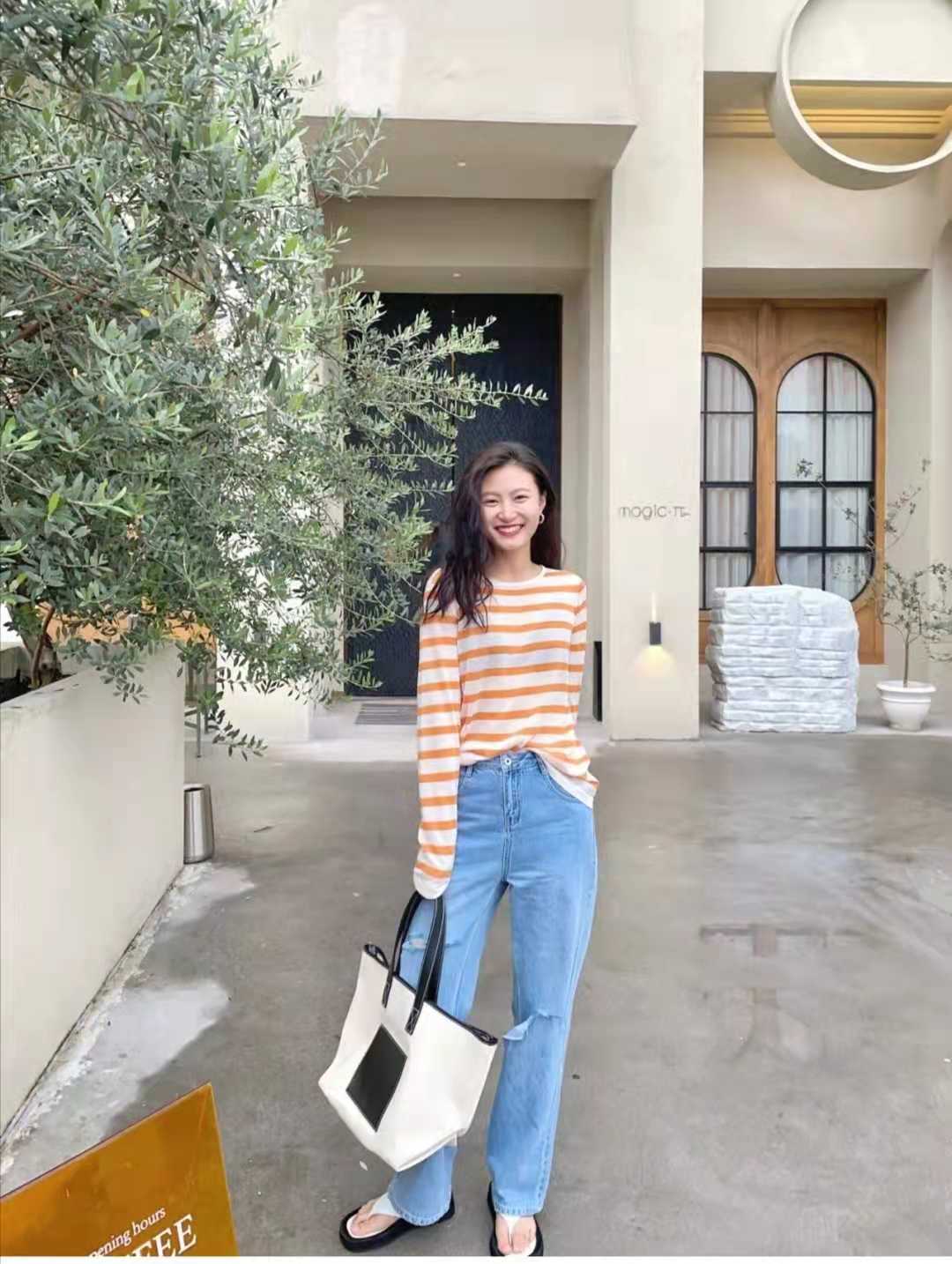 Jeans and T-shirt wear: This is my favorite casual, casual and comfortable daily wear. It feels comfortable and has no sense of restraint. The thin striped sweater can also be used as sun protection. The color is really healing. , the mood became more beautiful, casually wearing a pair of blue baggy jeans, the Korean style Ernie was immediately online.
