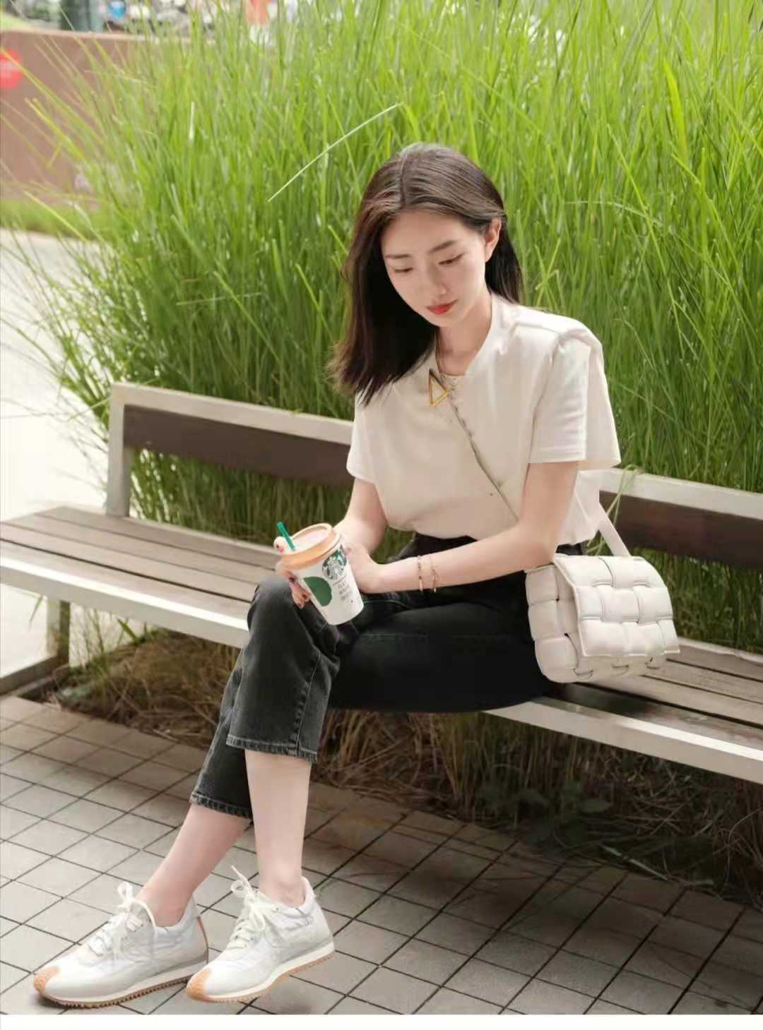Jeans and T-shirt wear: White shoulder-padded T-shirt paired with dark gray jeans. The shoulder-padded version can make the original simple short-sleeve style full of aura and beauty, and it can also make the whole person look energetic. The lower body rotates with nine-point jeans, and light-colored sneakers match the top.
