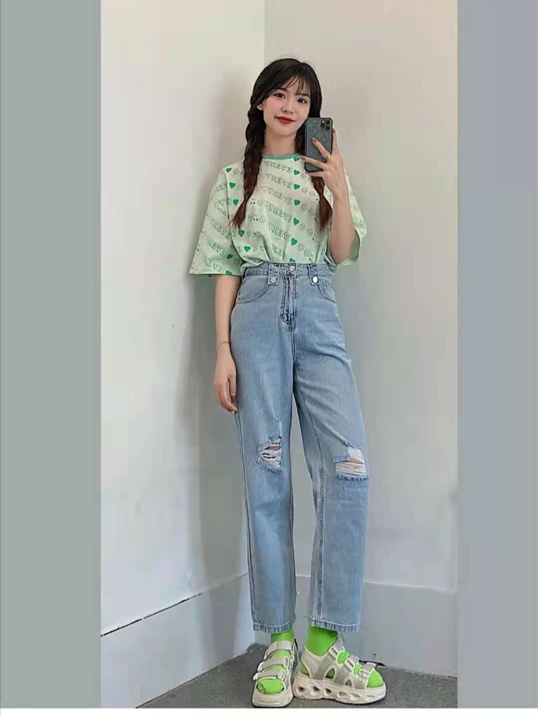 Jeans and T-shirt wear: The color of the top is also very white. The color of the T-shirt is very bright, which is super suitable for summer. It is very fresh and comfortable. The ripped straight pants make the legs slimmer and flattering. Good news for thick legs, the fabric is also very thin, so it won’t get too hot in summer.