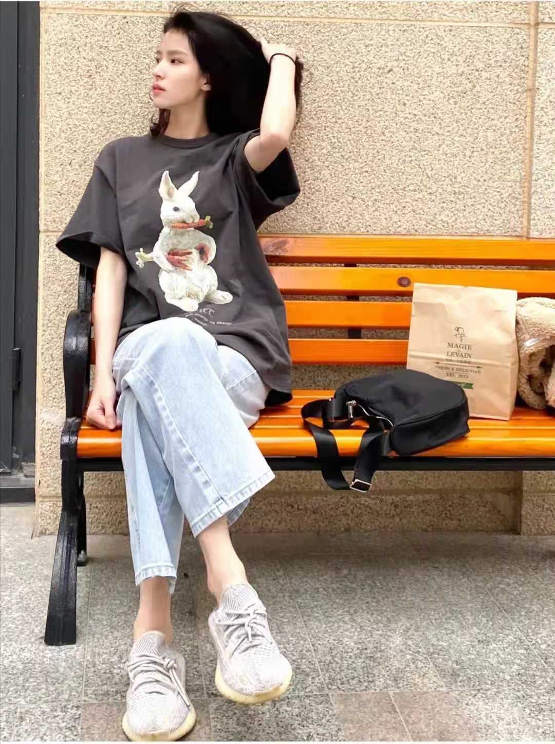 Jeans and T-shirt outfit: This outfit is casual in summer. The print on the T-shirt is very cute, with a pattern of a little bunny eating a carrot. The dark gray color is high-end and comfortable. The lower body is paired with light blue denim. Wide-leg pants + shoddy-feeling coconut shoes, a casual outfit that makes it easy to go out.