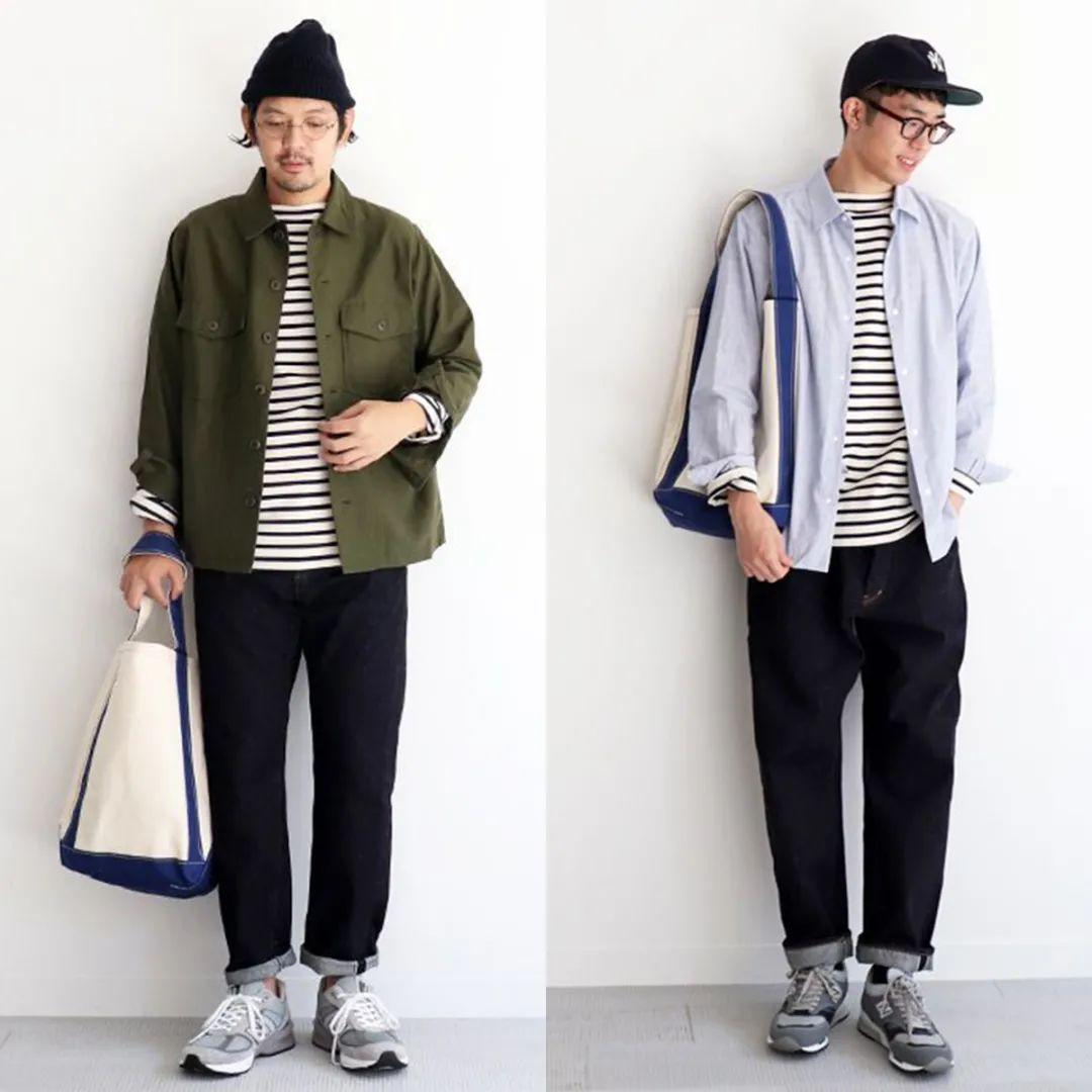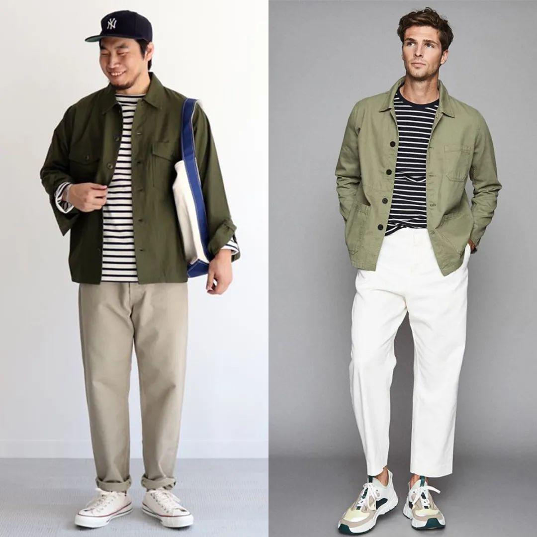 Pair an army green work jacket with a striped T-shirt, and the layering of the upper body will appear very good. At this time, the trousers can be simpler, and the light-colored trousers can be controlled, and the style will be very tasteful.