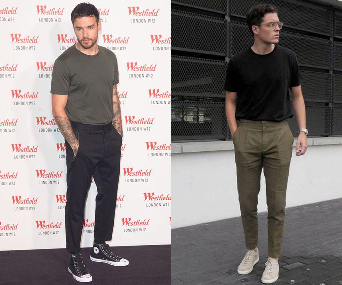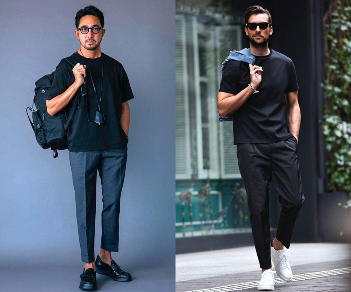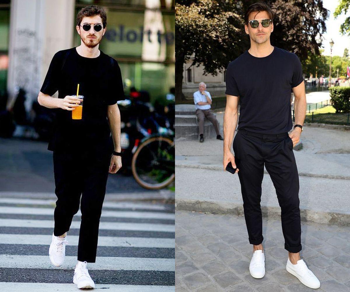 Such a pure black T-shirt can be paired with some cool or warm-toned bottoms, or a contrasting color scheme can be used. However, when choosing a black suit, remember to add some other colors to embellish it, so that the overall shape can be more bright. Choosing white shoes like this to highlight it is very casual and simple.