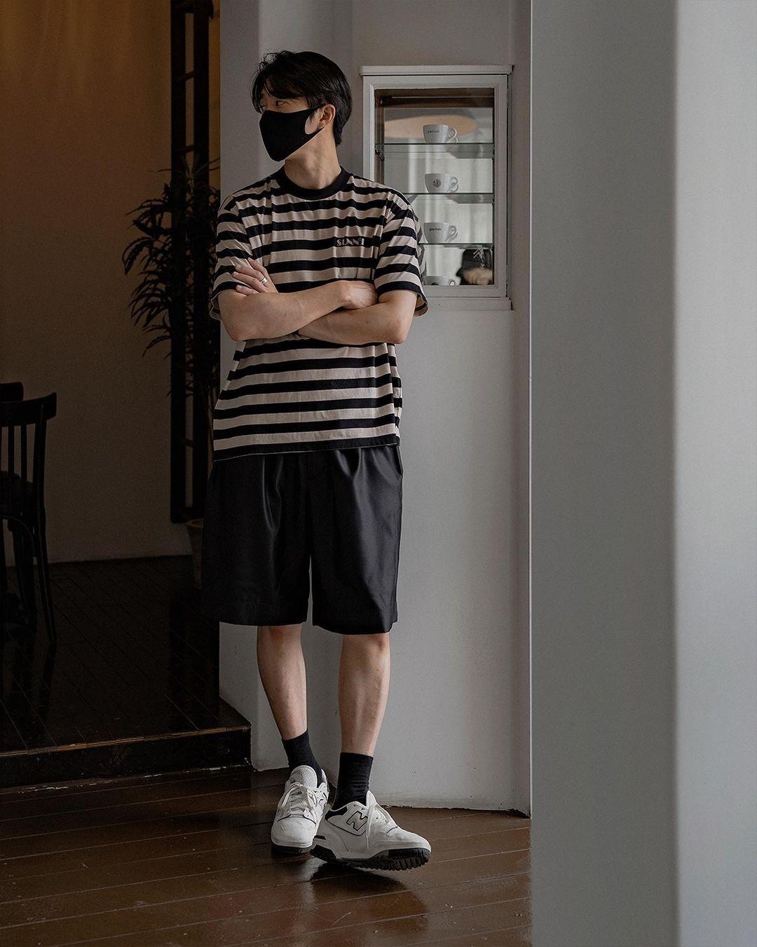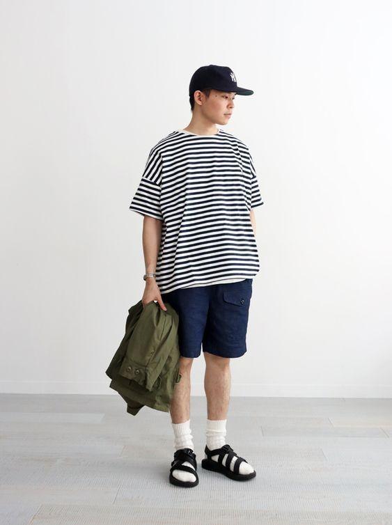 In this hot summer, visually It has a refreshing feeling and a nice cooling sensation. Don’t try to be the same, pay attention to harmony in color, it looks very harmonious. T-shirts are all long and black shorts are worn underneath, which is very common on the street.