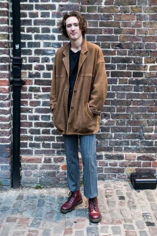 Another layer of expression of retro style is to re-break and combine many old-fashioned items, like too individual striped trousers, it is a big problem for men to choose to match them in daily life, but when combined with red Martin boots with the same personality and full of charm, the texture of the two styles collides and makes people feel bright. Added to the background of the brown jacket, it is super attitude. A mainstream display.