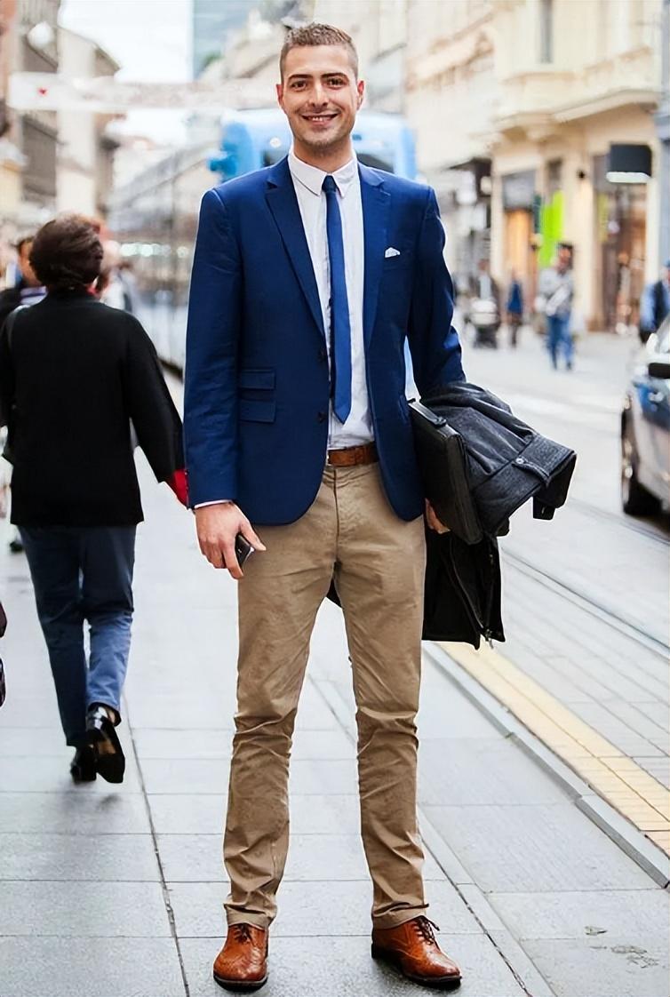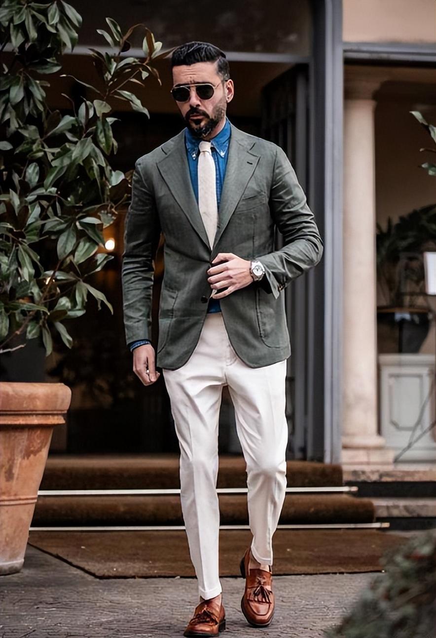 Khaki has always been popular among various items, which is the ultimate improvement With its stylish color scheme, even changing into casual trousers cannot break its elegant charm. And even if the colors of the upper and lower items are in contrasting colors, the colors are completely harmonious, and the interior is set off with white, and the look is fashionable enough. Mixing and matching can change many styles, but some people will not change the fixed combination of suits and shirts. It is also a good way to start with trousers and change them a little bit.