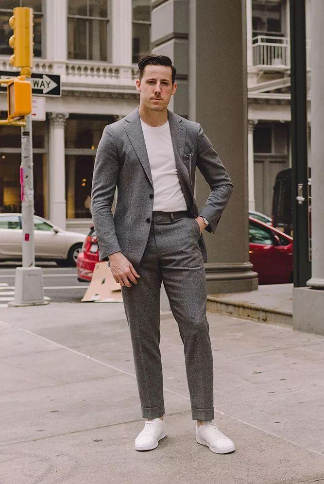 Mix and match with sports shoes to create a trendy style, making the suit look casual and fashionable. You can try it at the beginning Choose some lightweight or smaller sneakers to make the look easier to pull off.
