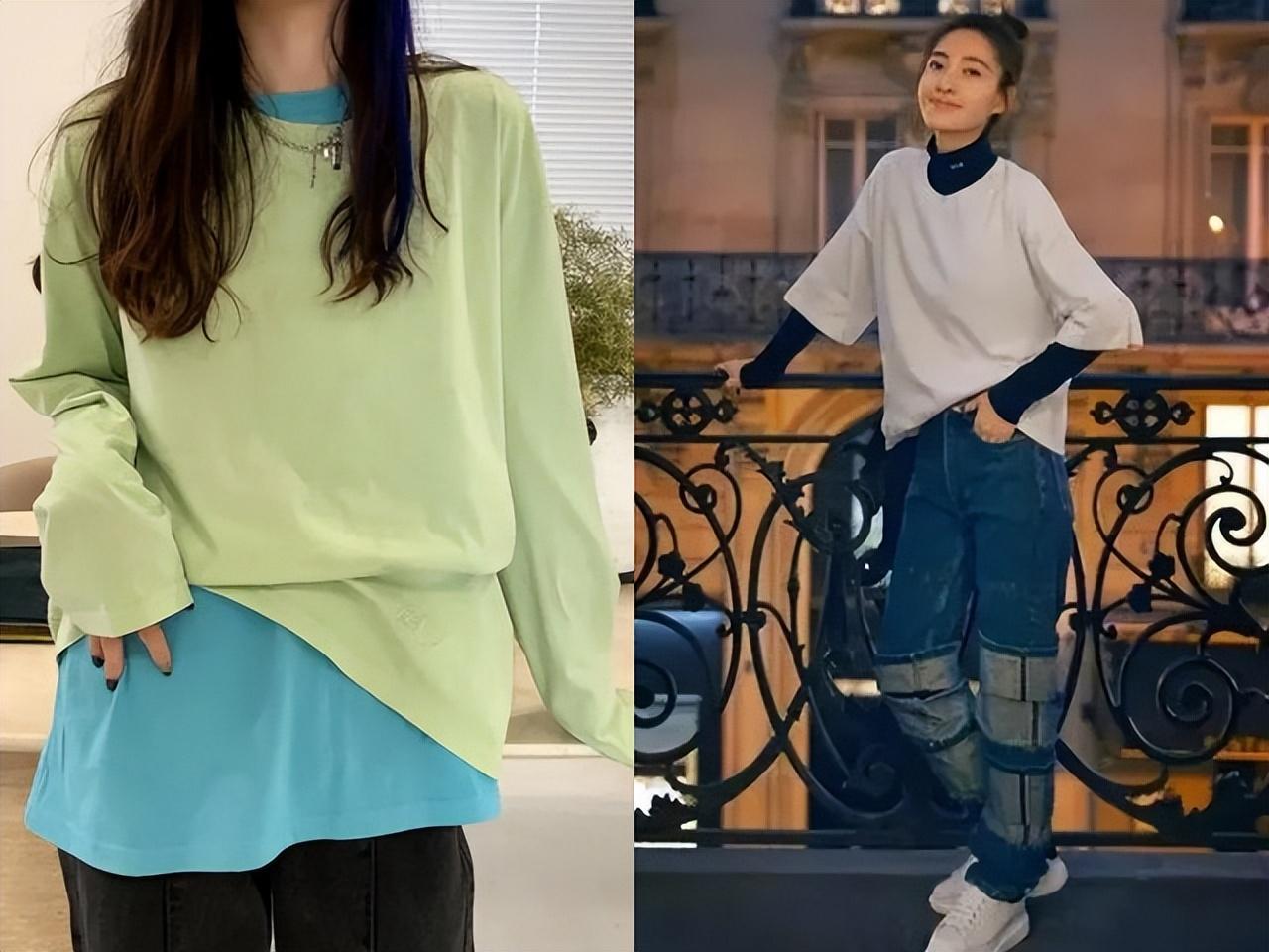 Two long-sleeved T-shirts of different colors in contrasting colors, or A short-sleeved T-shirt in a contrasting color is layered with a long-sleeved T-shirt. Two ordinary T-shirts instantly create a fashion sparkle. Then slightly sort out the different layers of layers, and passers-by will instantly look like fashionistas.