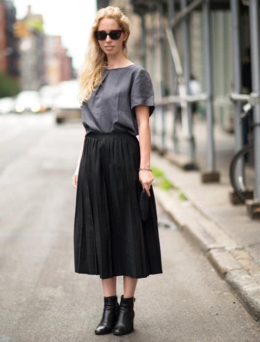 Between black and white, pick a dark gray T-shirt and a black pleated skirt. It looks more than a little slimmer, and it is straightforward yet high-end. Tie a gray T-shirt into a black pleated skirt, which not only lengthens the body proportions, but also gives a girlish look. The existence of black short boots is simple and extraordinary, creating a gentle and ladylike style, full of vitality.