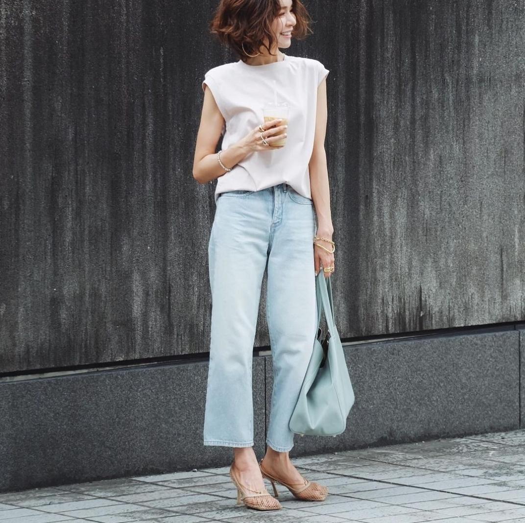 ⑨白色棉质T恤,自在轻盈,亲肤舒适,张弛有度的版型,不疾不徐,自放光芒。不用多么突出女人味,光是这份慵懒清凉的夏日情调,就已经稳赢了。高腰浅蓝色九分牛仔裤,干练简约又不失优雅,脚踩裸色高跟鞋,将日系小女人精致风骨展现得淋漓尽致。越是简单的搭配、越不能忘记细节处的点缀,佩戴好耀眼的金色配饰,拎上天蓝色软皮包包,就这样惬意的走在路上,成为万众瞩目的焦点吧。