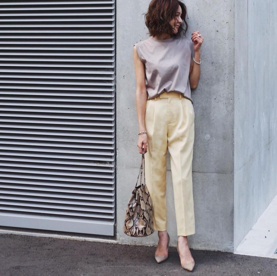 ⑧搭配讲究分寸和谐,这是一个冥冥之中永恒存在的规定,落实到穿搭中可以解释为全身上下只能有一个出彩的地方,剪裁设计和配色耀眼则一突出,灰色的无袖T恤款式很简单,很自然地露肌肤为整体减压,下面配上黄色锥形裤,优雅知性中不乏沉稳大气,越是简约的剪裁设计、越能突出配色的优异,高不高级一目了然。
