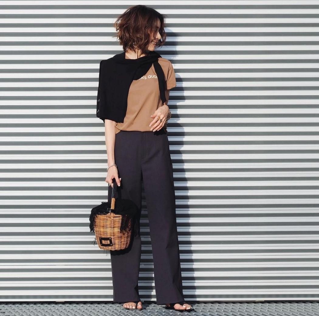 ⑯卡其色T恤配黑色阔腿裤,一条黑色披肩聚焦亮点,让慵懒惬意的随性姿态占据上风,很喜欢这里藤编包的使用,比一般的商务皮包要更具有浪漫放松的情调,拎在手上、瞬间有提亮的神奇效果。