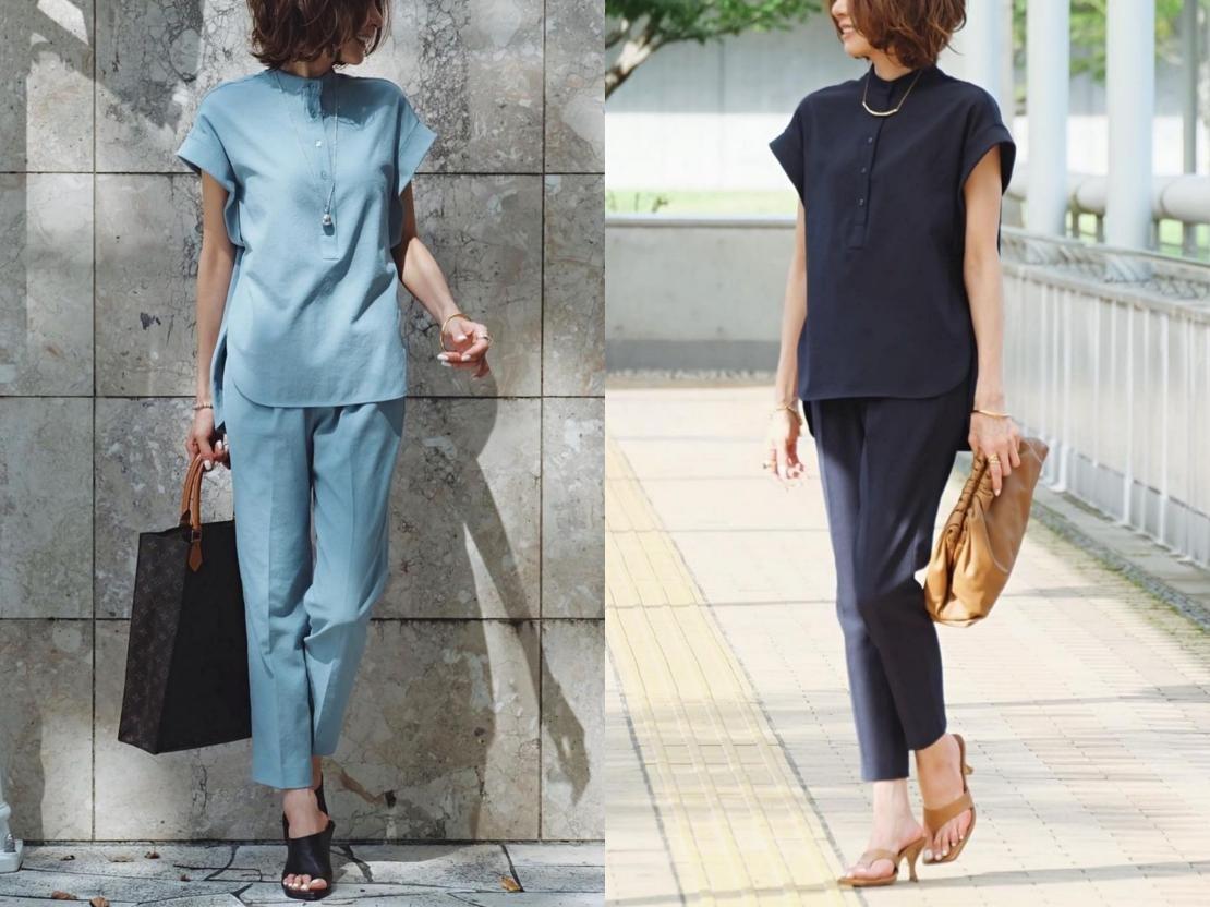 同色系应当是我们在搭配时首先考虑的方法,来看看这两套Look:①浅蓝色长款T恤搭配同色系的西装裤,清新雅致又不失知性美感,纯净的天蓝色混入了一点灰色而变得浑浊,散发着宁静祥和的气息,与成熟女人优雅的气韵完美融合。