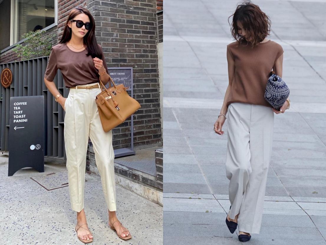⑫⑬这两套Look采用的都是棕色T恤+米白色西装裤,但是因为衣服剪裁和个人气场的不同、而焕发光彩。左边:大圆领宽松T恤松垮有型,利用几分西装裤,把握住了休闲随性与干练端庄之间的分寸,再加上墨镜和棕色公文包的点缀作用,皆是大女子职场潇洒、倜傥本心的演绎。