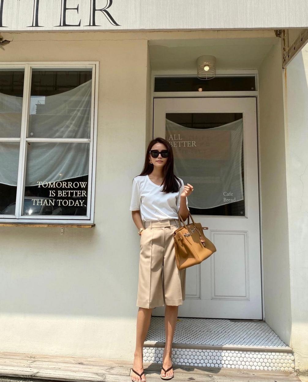 ⑭挑选白T的一个很重要原则就是薄而不透,就像上图这件白色圆领T恤,虽然松垮但是极具风骨,剪线、领子、袖口、宽松度这些地方都做到了完美。下面将长款的西装裤换为五分“爸爸裤”,严肃正式的调性瞬间烟消云散,取而代之的是帅气不羁的中性格调,纤细的四肢和细腻的肌肤为整体注入女人味,拎上棕色公文包,轻松穿出酷美。
